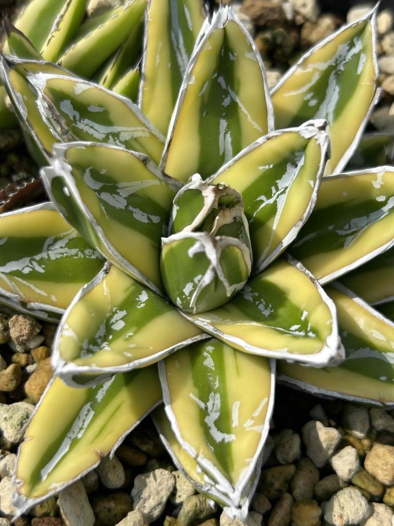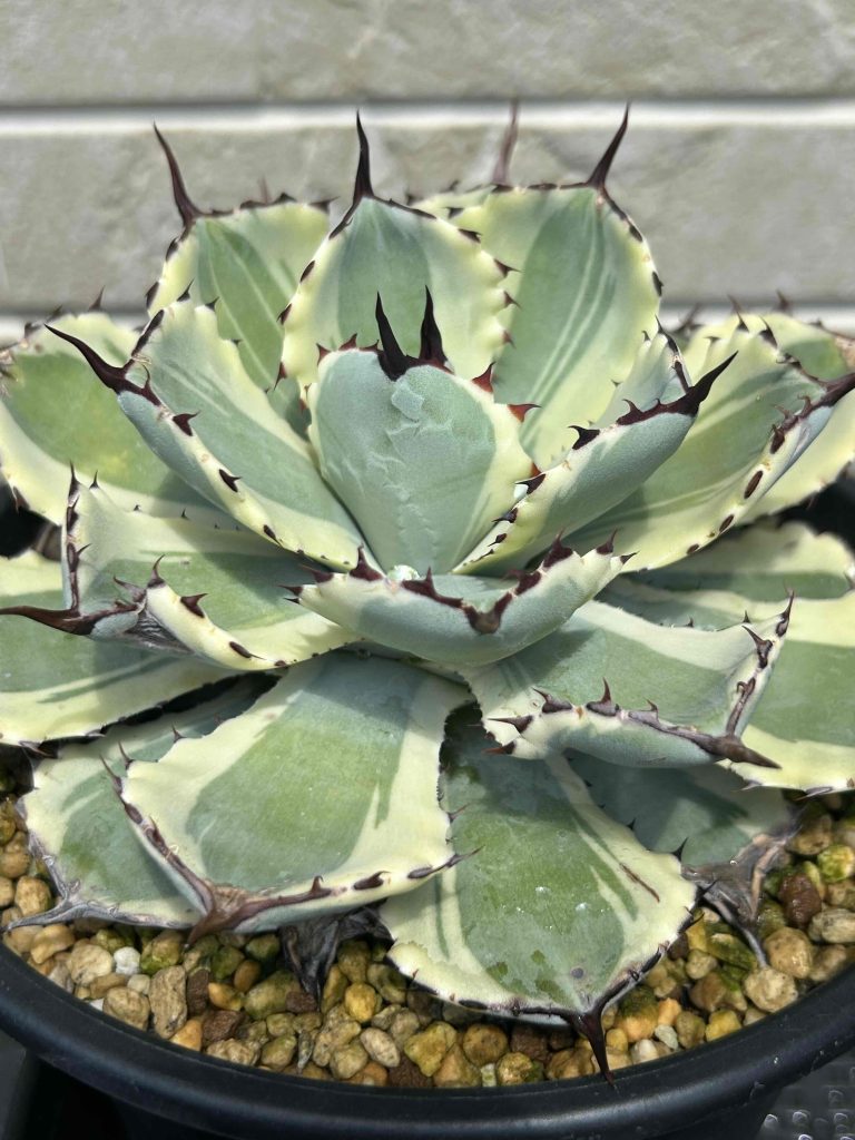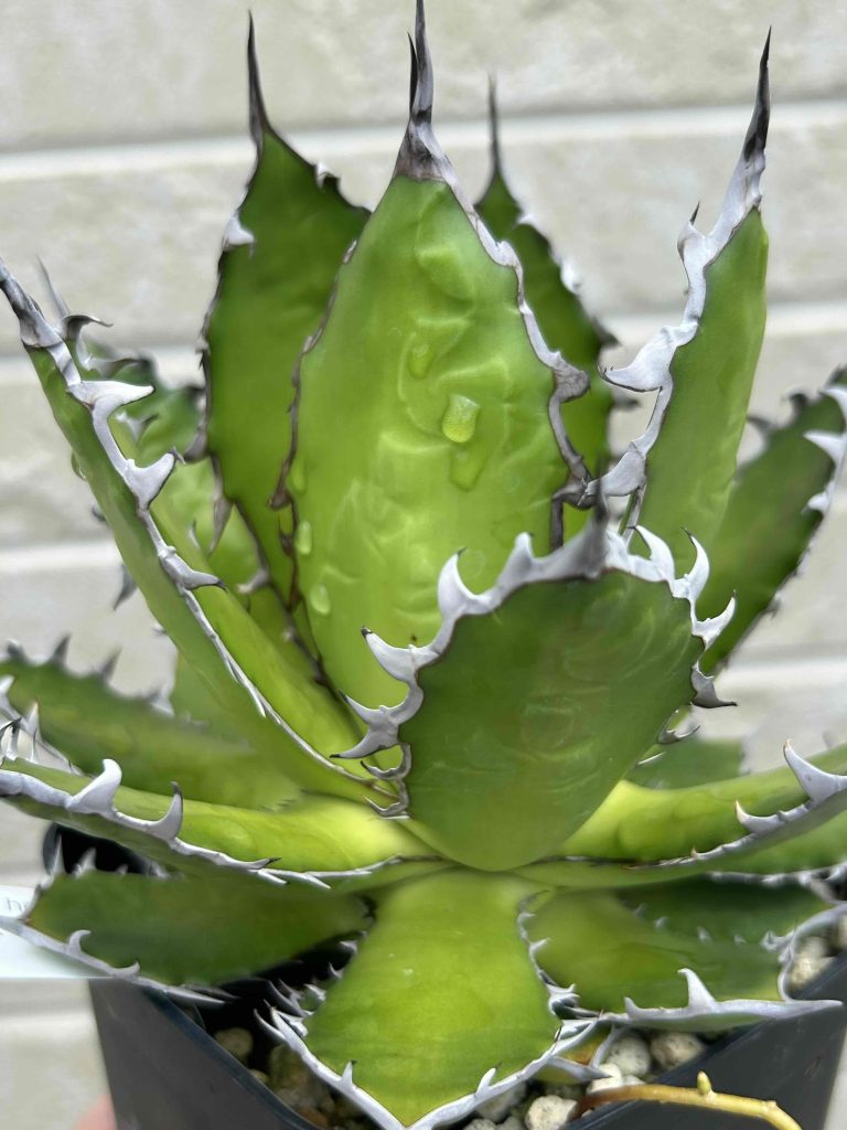 ‟ペンキ”と呼ばれる白い模様で、葉を色付けるアガベです。 その名のとおり、まるで雪が積もったようにうつくしい見た目は、他に類を見ないアガベと言えるでしょう。 気難しいと言われることもありますが、寒さに強く、全体的に見れば育てやすいアガベです。 アガベの中でも成長は遅いため、じっくりと育てていくタイプの品種です。