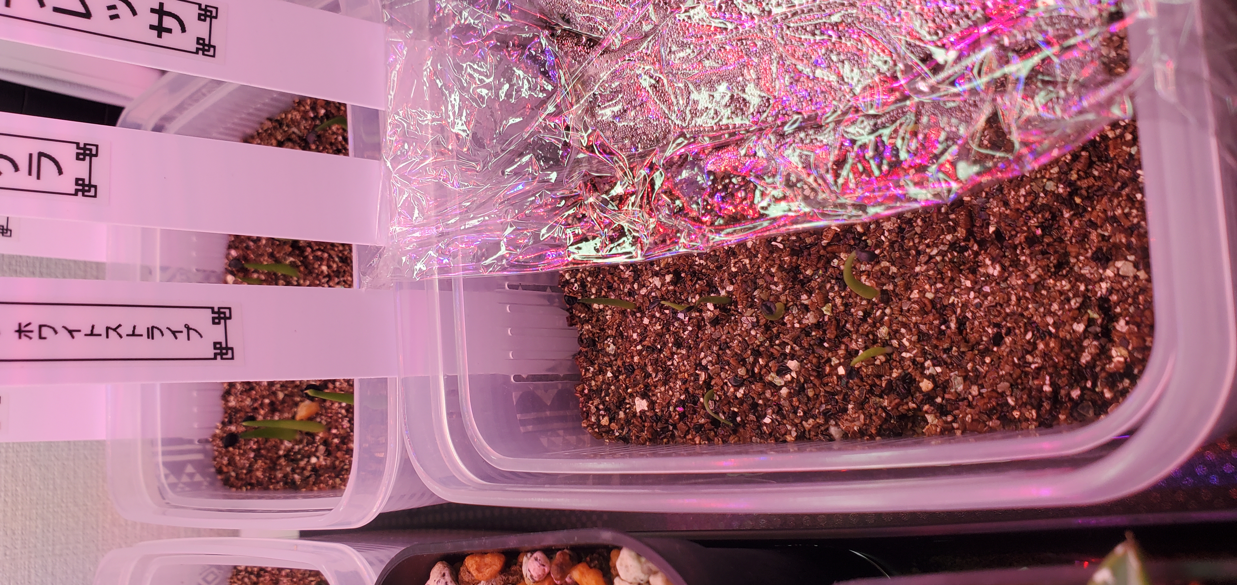 赤玉、鹿沼土、軽石の用土にバーミキュライトを敷き播種、室内で育成ライトとヒーターマットを使用し20度〜25度で管理