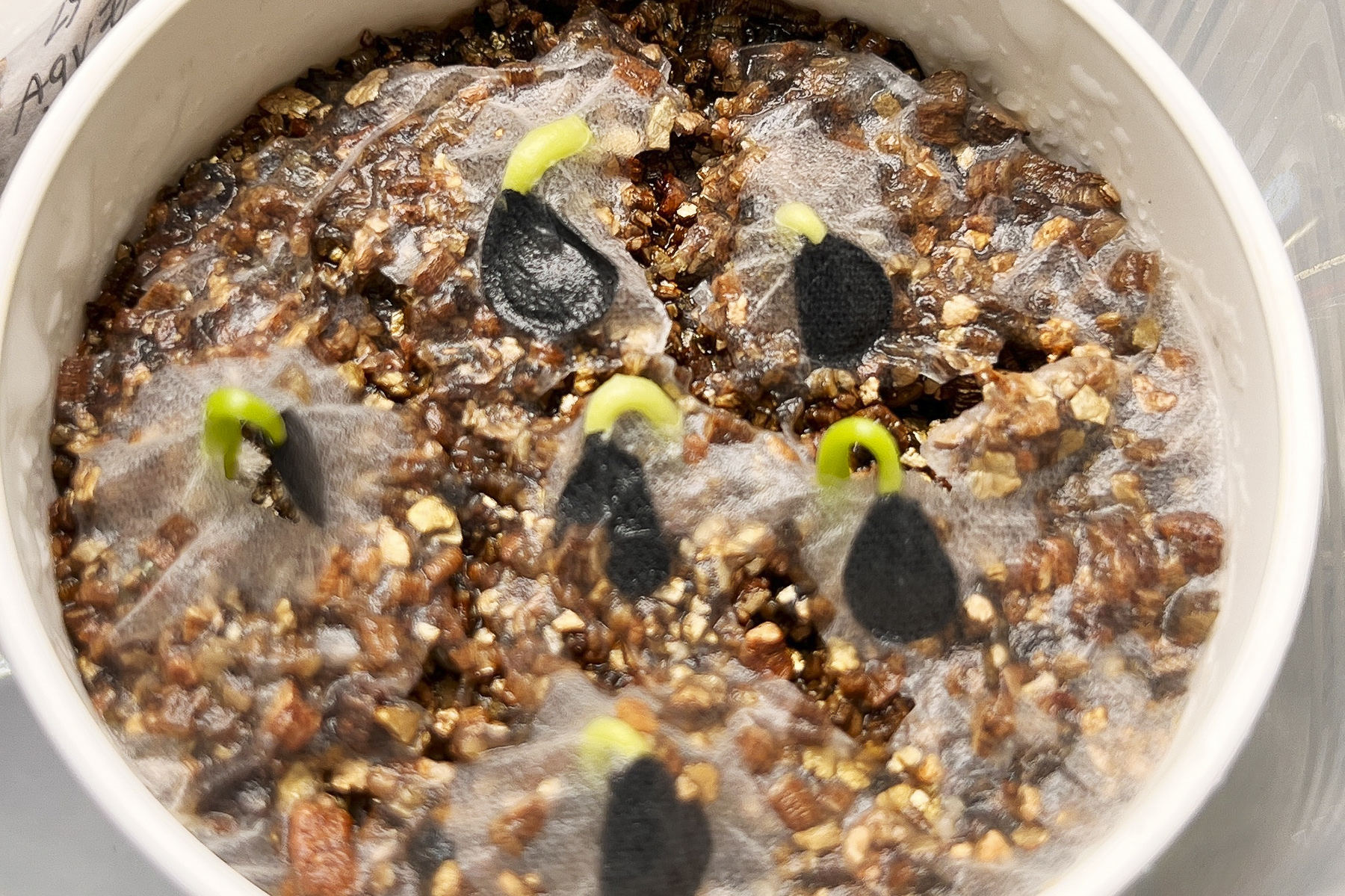いつもはやらないのですが、今回、湿度を保つために種の上にテイッシュを被せて管理