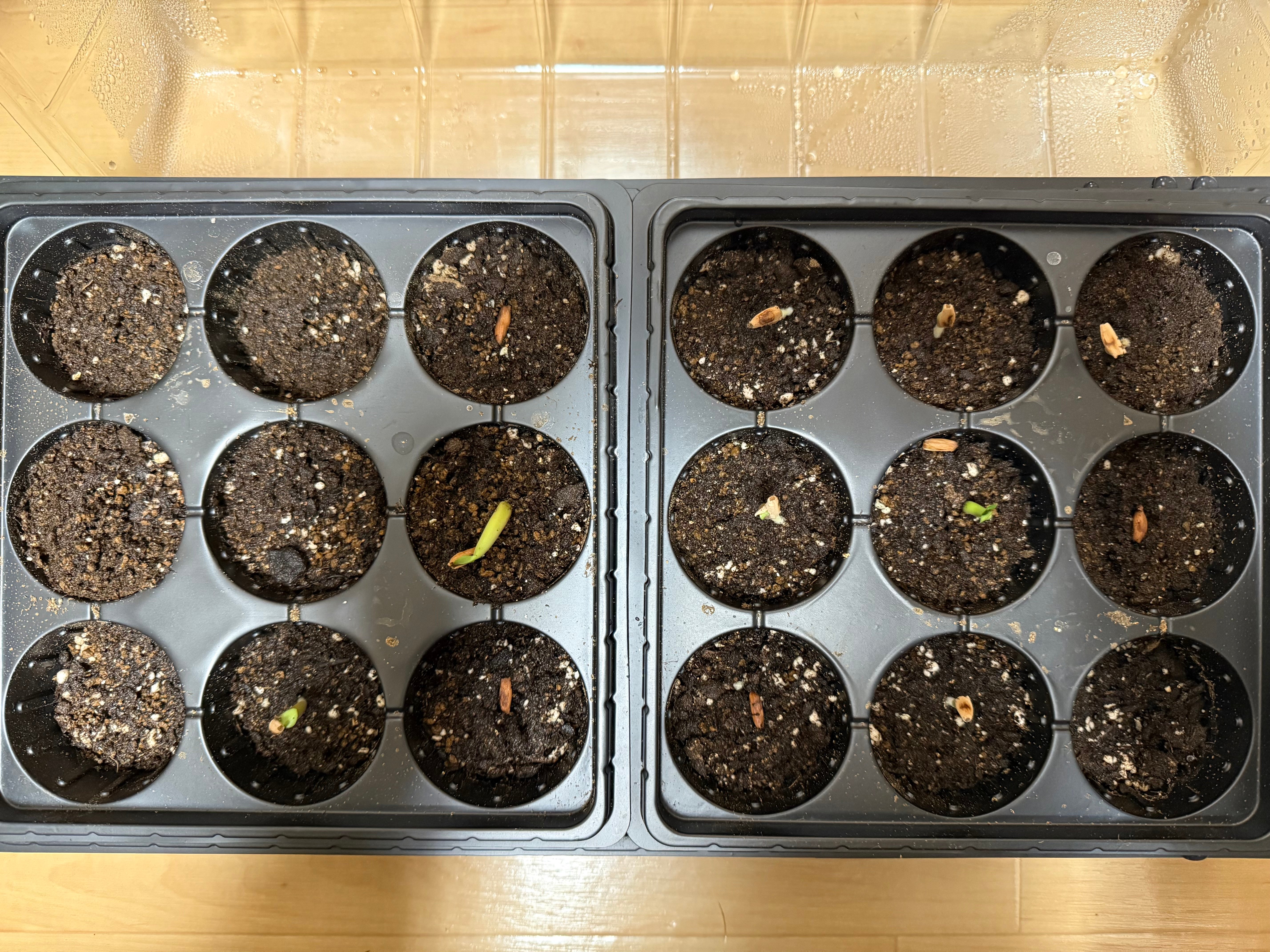 5粒。播種:2025/11/3、2025/11/15ココピート100%とメネデールです。赤+白で12...