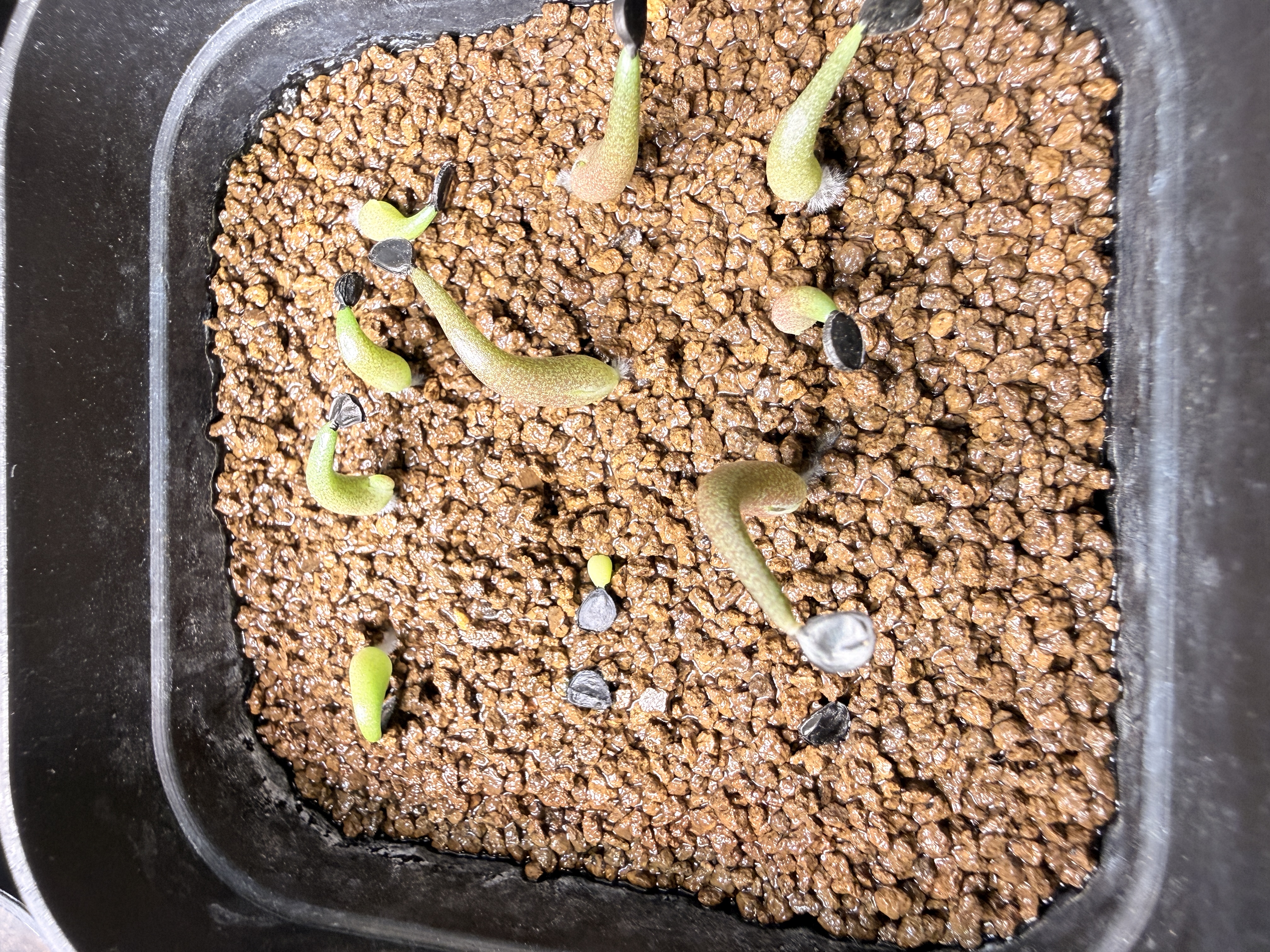 2025/09/05播種→2025/10/28撮影12粒→3粒発芽・9/556時間吸水させ、種の上か...