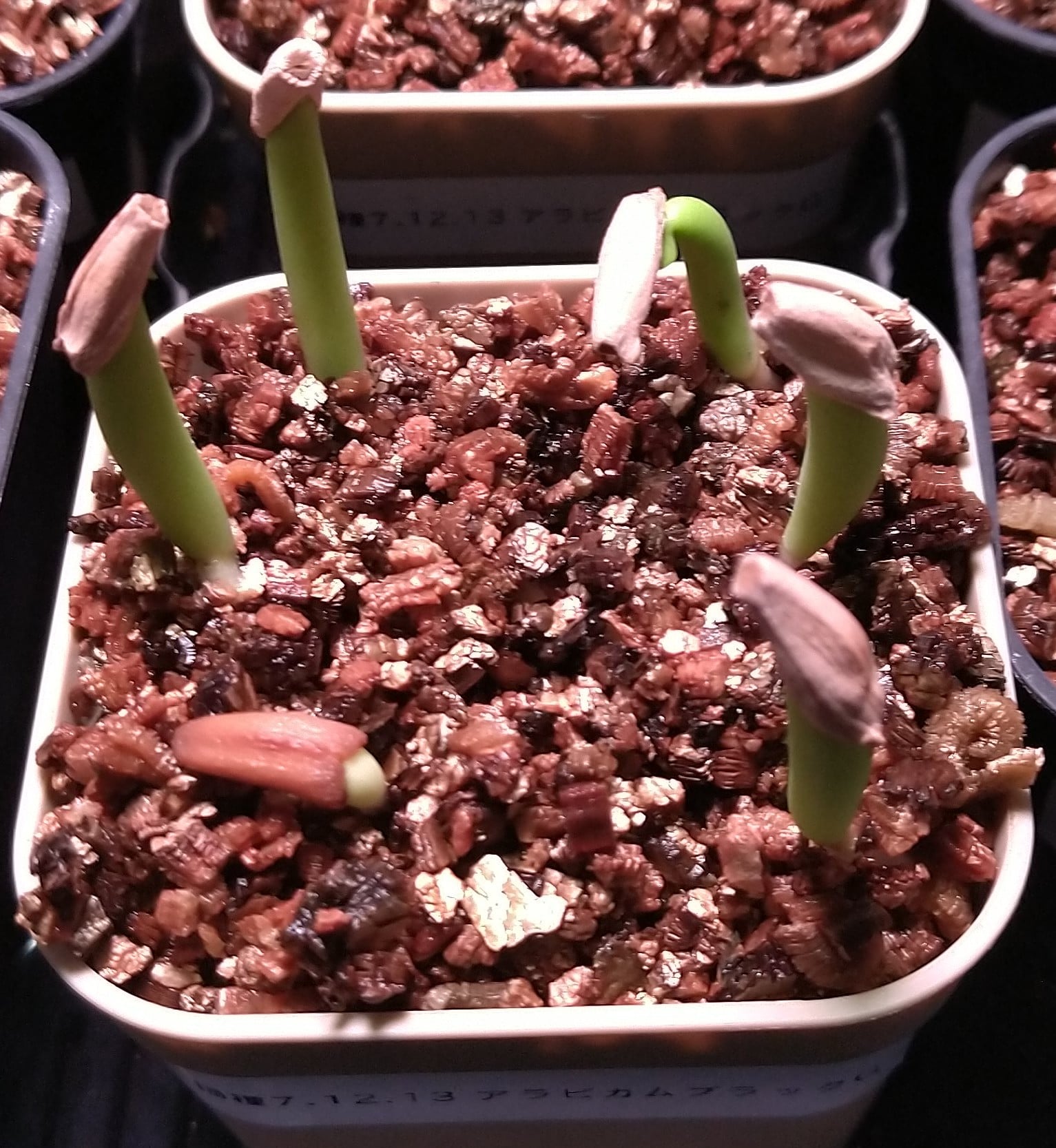 2025/1 2/13播種 2025/12/19撮影12粒播種10粒発芽 1粒未発芽 1粒カビ播種前...
