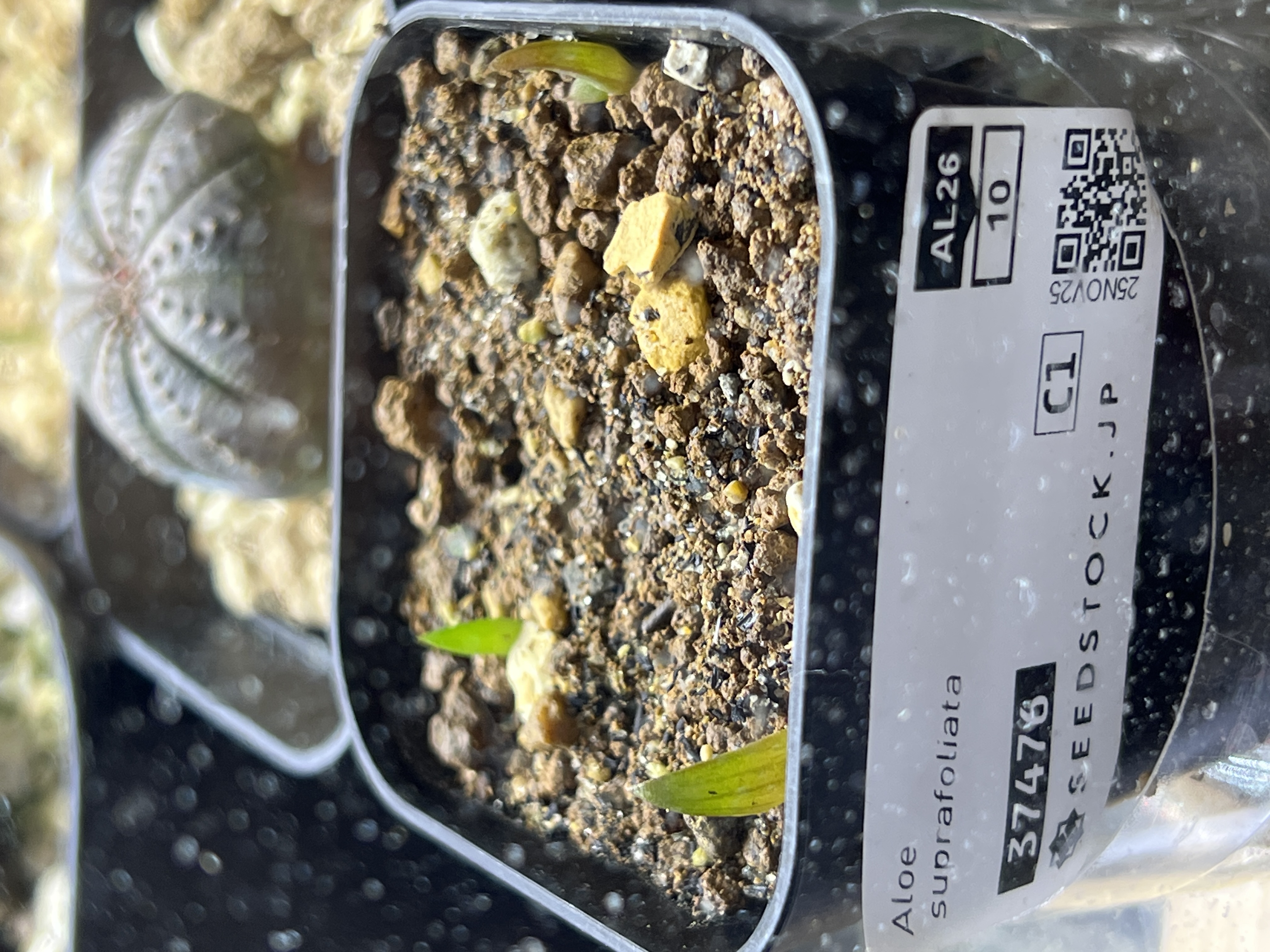 2025.12.25播種2026.1.6撮影種子をダコニール水に1日程浸けて塊根植物用の用土の上に赤...