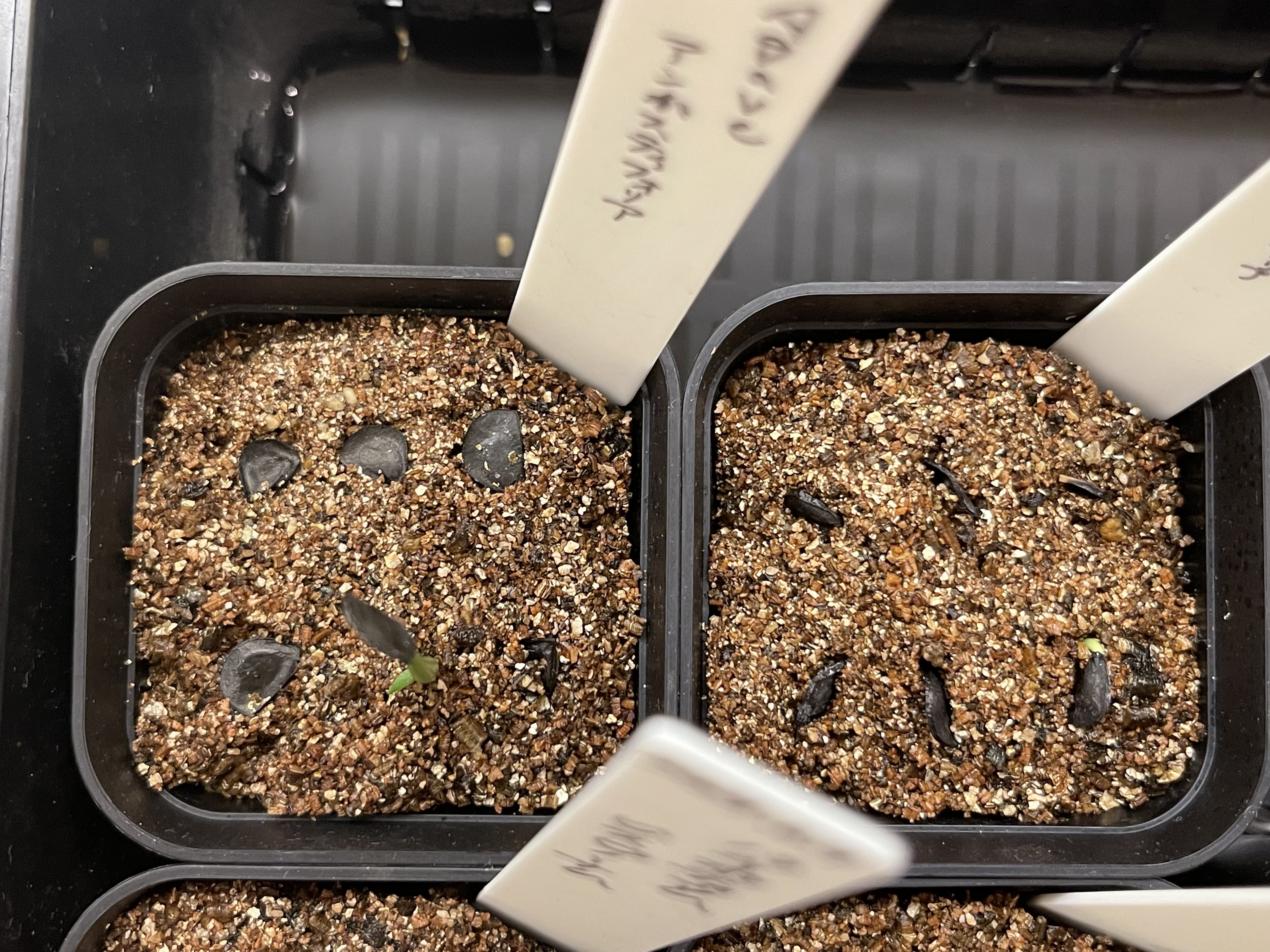 [ 播種日 / 撮影日 ]例: 2024/6/9播種 2024/7/1撮影[ 播種数 / 発芽数 ]例: 12/2粒[ その他(用土や管理方法など)]例: 播種前にベンレート+メネデール溶液に10時間程度浸漬用土はミックスの細粒の上にバーミキュライトを敷き播種、腰水管理で1日置きに交換、日中は主に外で管理し夜は室内で25℃