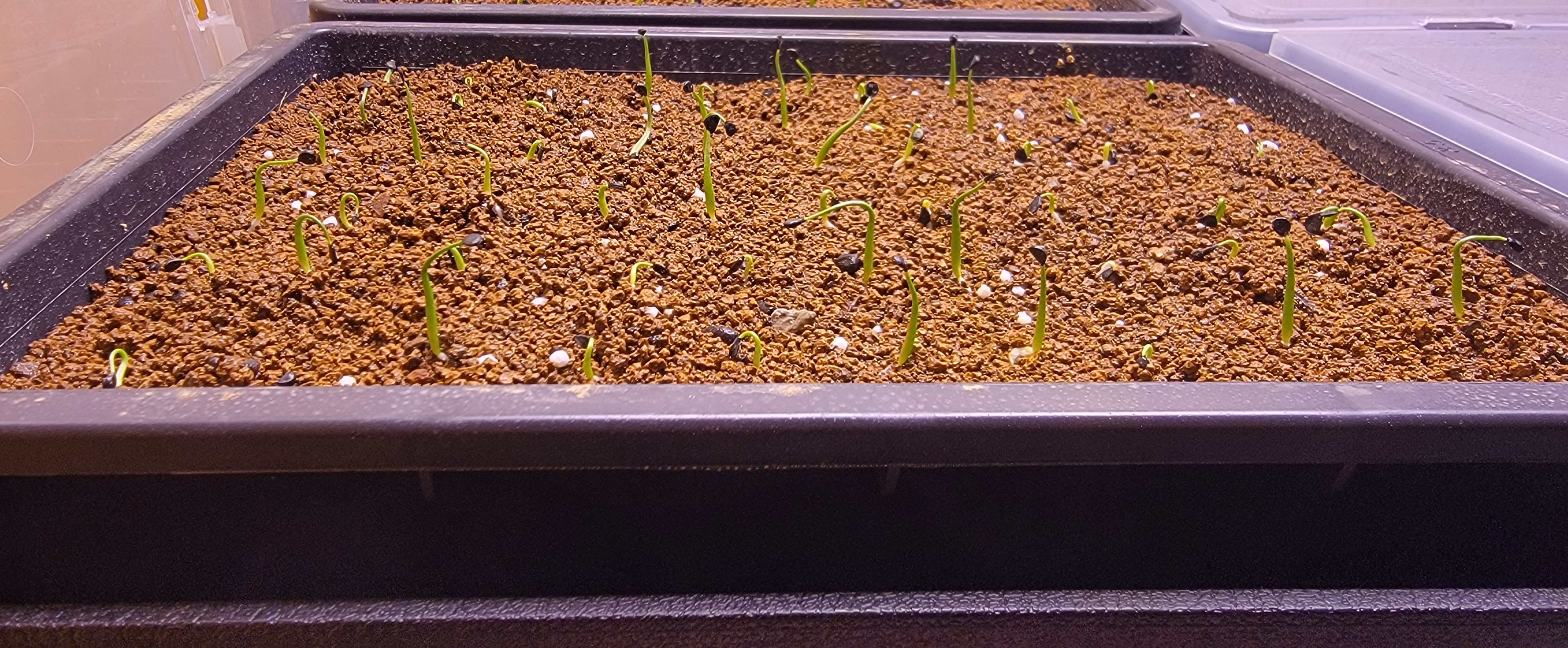 軽石ゴールデン培養土赤玉土に播種し、25~30℃でカバーをかけて管理。