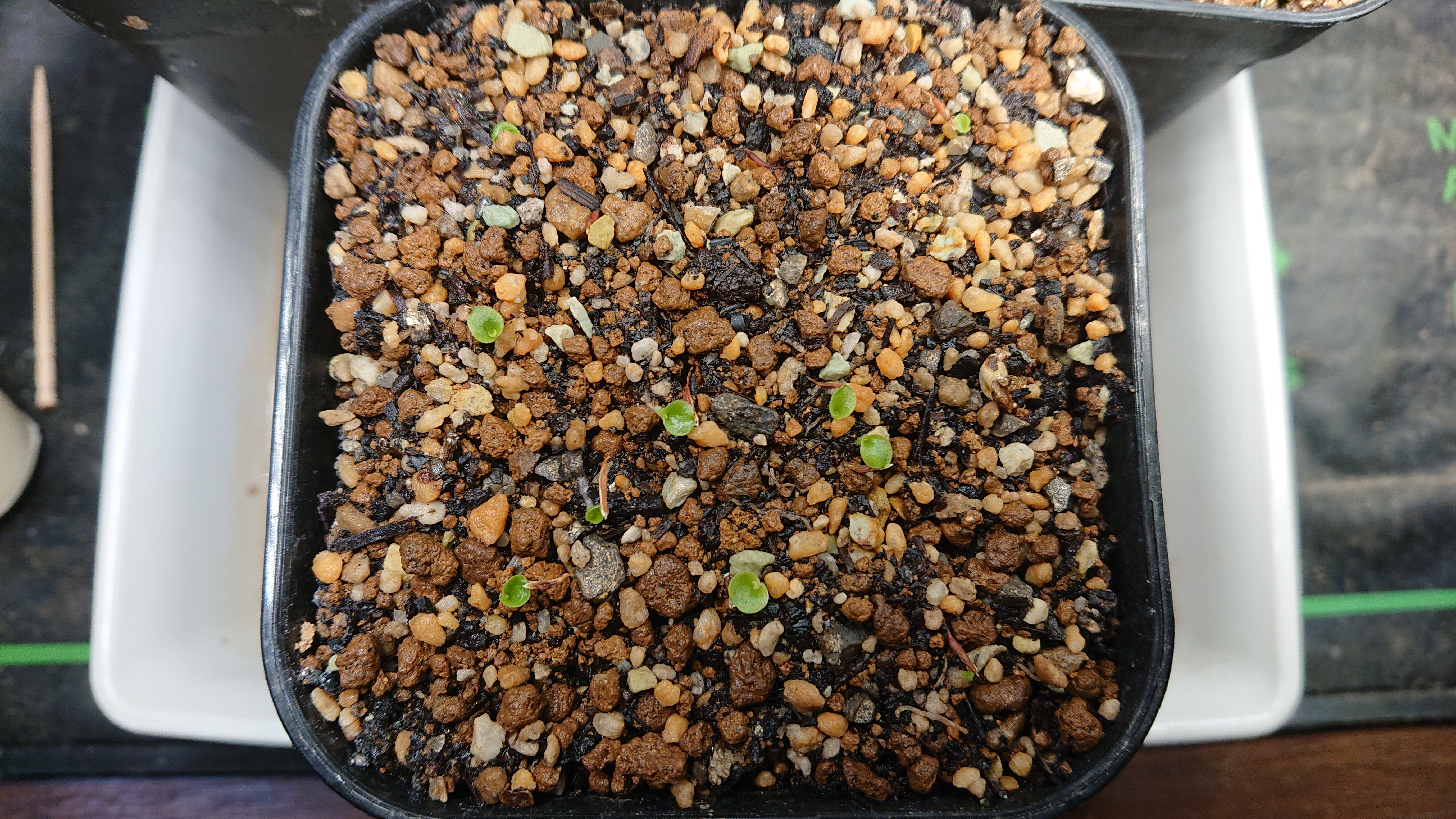 用土:サボテン用土細粒、熱湯消毒処理:特になし管理:腰水(ベンレート2000倍+メネデール100倍液)、ラップ、温床マット、育成ライト播種日:R6/7/6発芽日:R6/7/11発芽率:83%(10/12)(7/14現在写真)