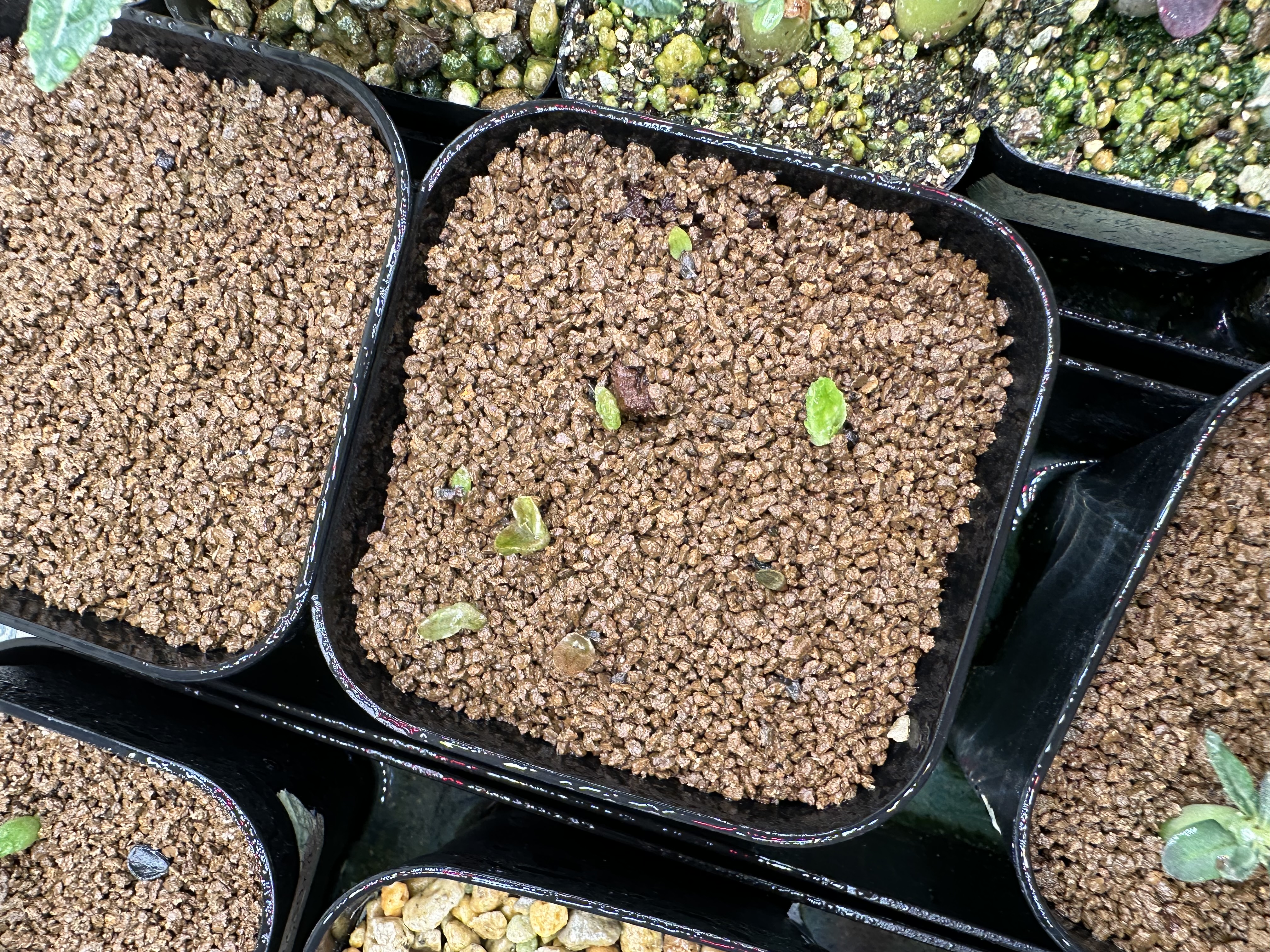 播種日 / 撮影日 ]例: 2024/5/10播種 2024/6/22撮影[ 播種数 / 発芽数 ]例: 10粒/ 8粒[ その他(用土や管理方法など)]例: 播種前にメネデール溶液に1日程度浸漬多肉用の用土の上に細目の赤玉土