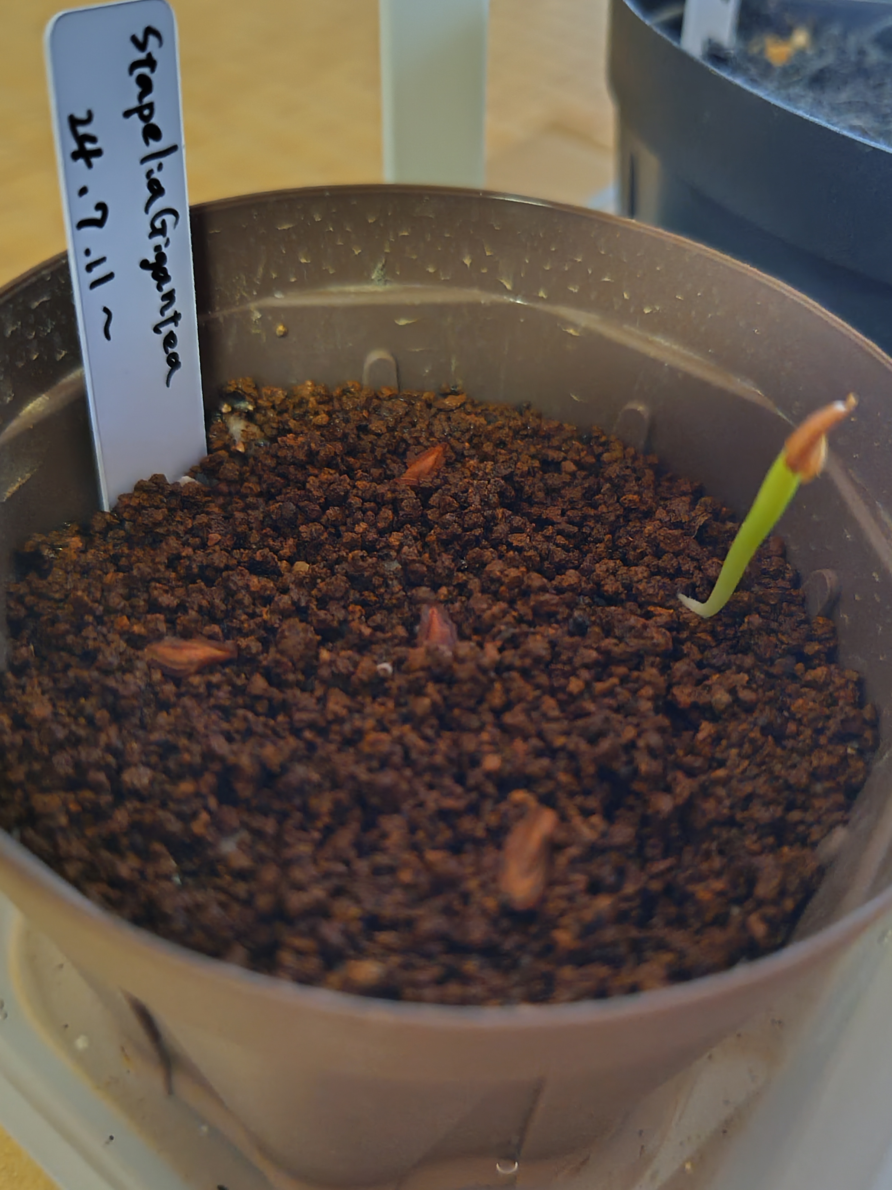 [ 播種日 / 撮影日 ]2024/7/11播種 2024/7/17撮影[ 播種数 / 発芽数 ]5粒/ 1粒[ その他(用土や管理方法など)]播種前にベンレート溶液に12時間程度浸漬