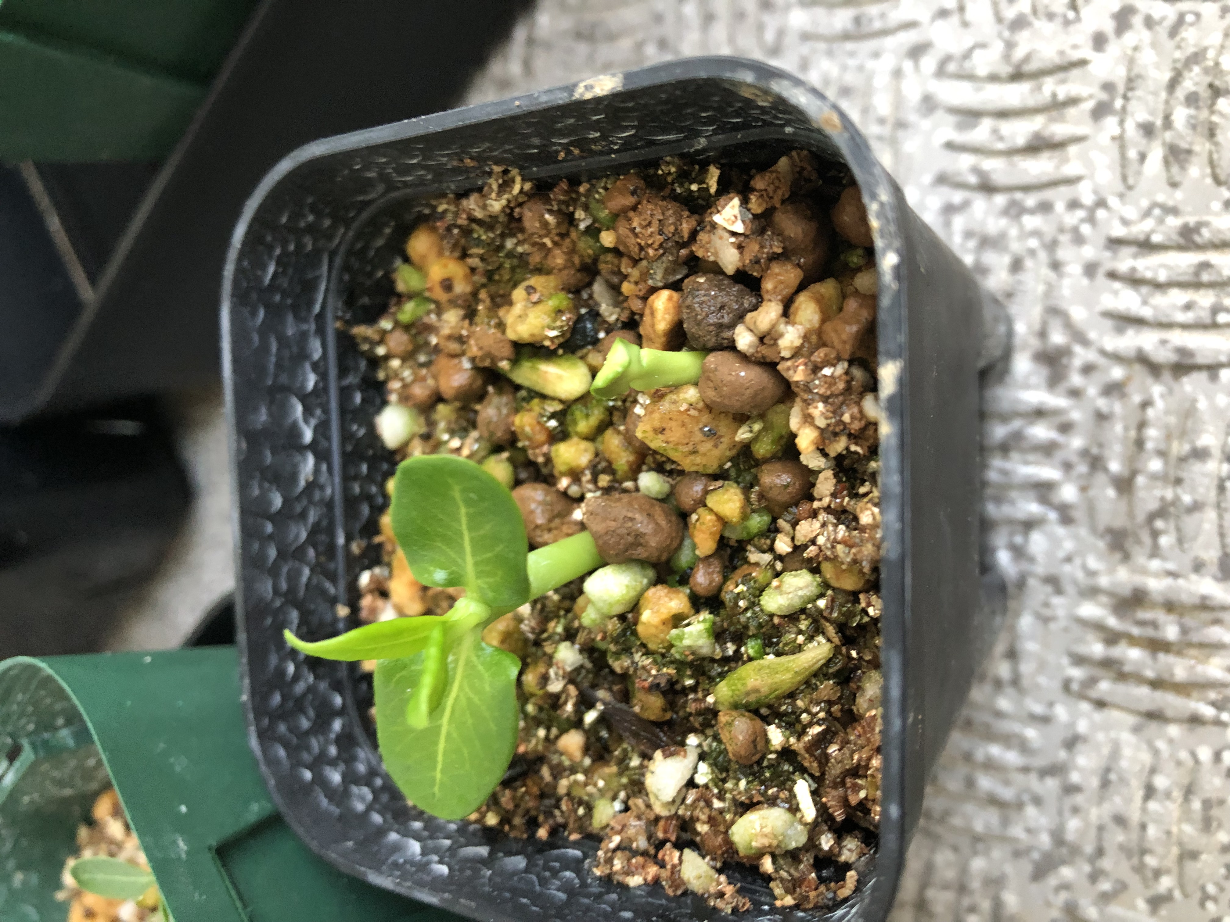 2024/6/22播種 2024/7/21撮影。播種前にダコニール+メネデール溶液に1日程度浸漬。播種数6粒 発芽数 2粒、加温加湿なし、カビはなし。播種2週間で1粒発芽、他はまったく動きが無いので乾燥させて再度トライしても変化なし。諦めていたところ1ヶ月経って1粒発芽。分からないものですね。