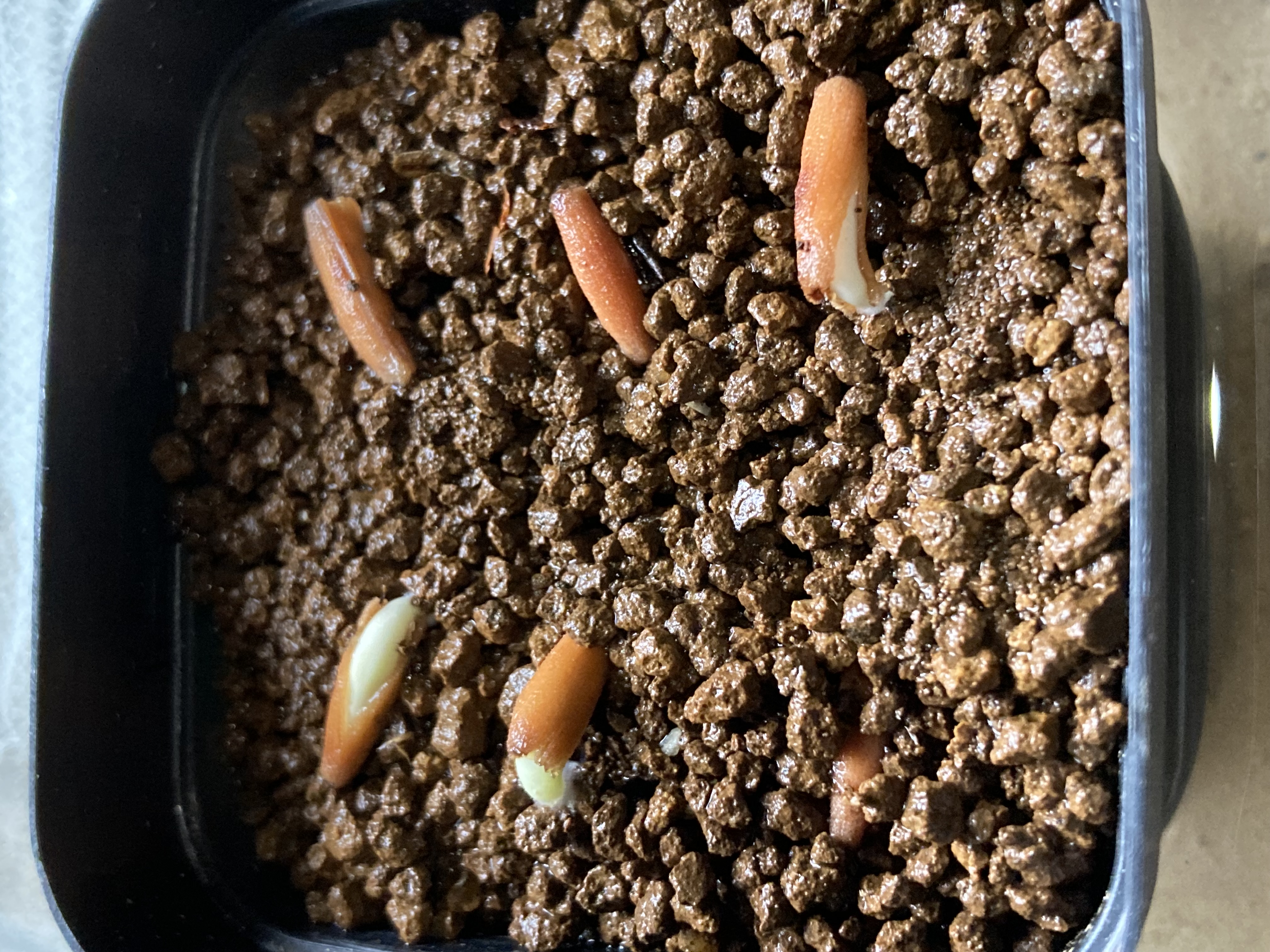 赤玉土、鹿沼土、日向土、桐生砂、クンタンの細粒のブレンドに赤玉土細粒を敷き播種