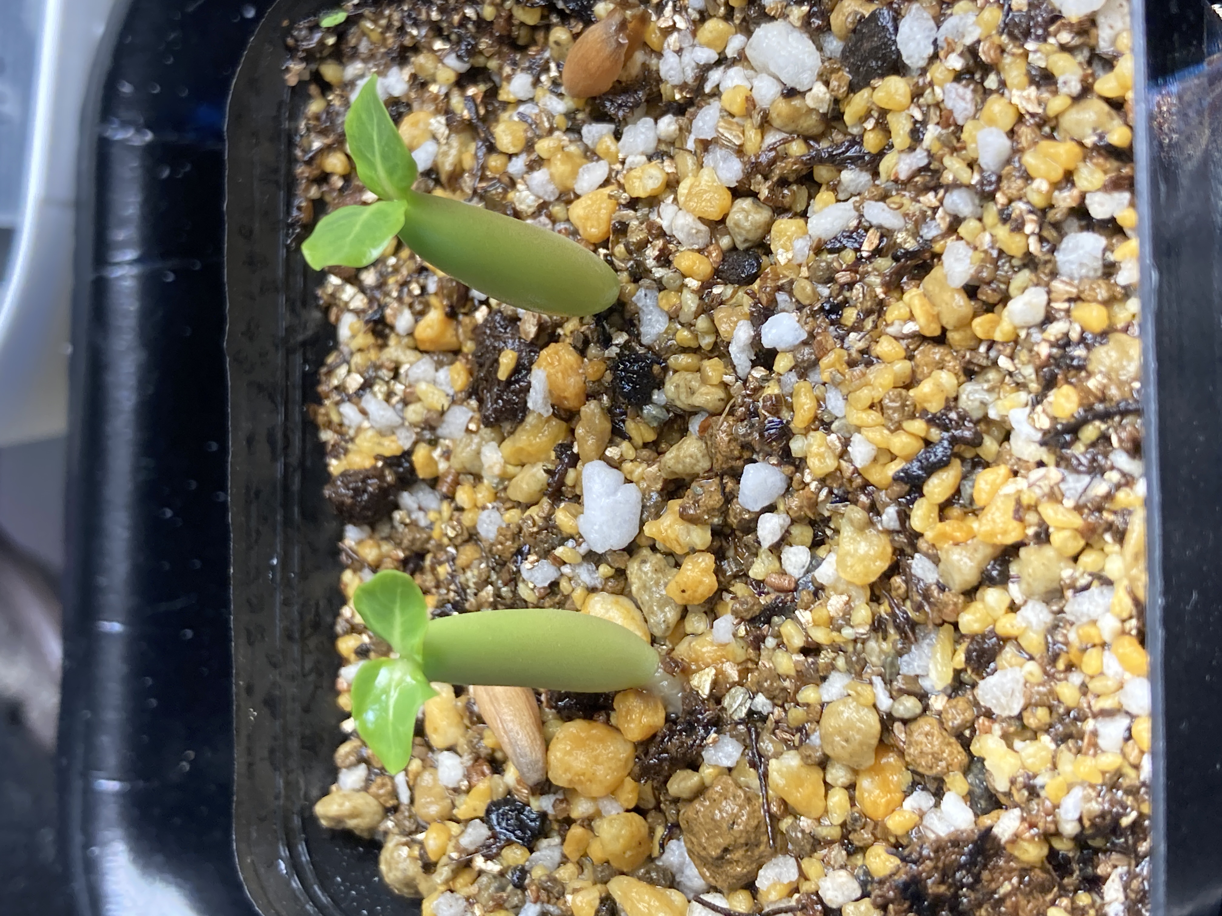 [ 播種日 / 撮影日 ]2024/8/ 4播種 2024/8/10撮影[ 播種数 / 発芽数 ]6粒/ 2粒[ その他(用土や管理方法など)]播種前にベンレート+メネデール溶液に10時間程度浸漬サボテン・多肉の土に細目の多肉用の土を敷き播種、30度前後で管理