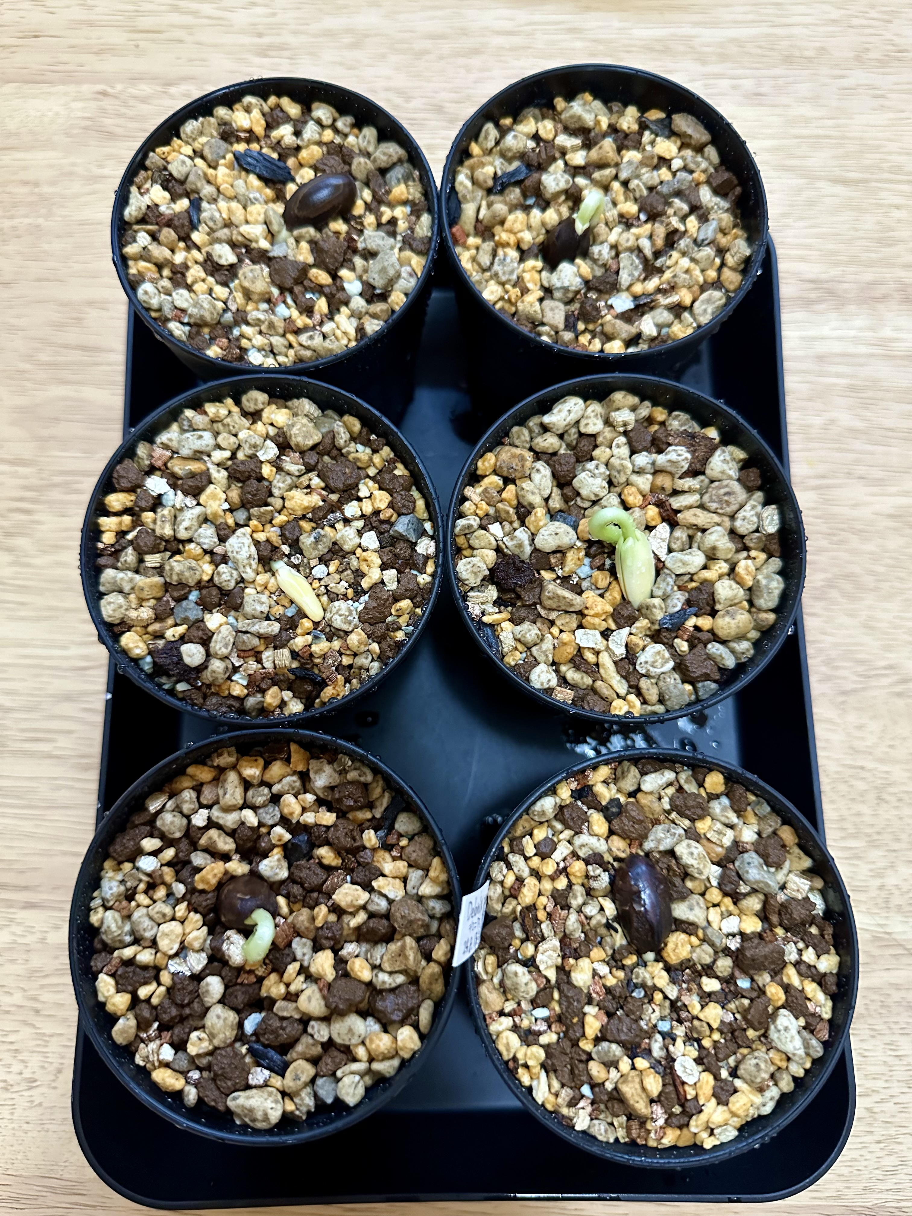 播種日 / 撮影日 ]2024/8/13 播種 2024/8/15 撮影[ 播種数 / 発芽数 ]6粒/ 6粒[ 用土や管理方法]播種前にメネデール溶液に1日程度浸漬赤玉2:鹿沼1:ゼオライト0.2の用土に播種、プラケースに入れ腰水をし夜間は蓋を締め管理、翌日発芽し個別に植付け腰水で管理中。