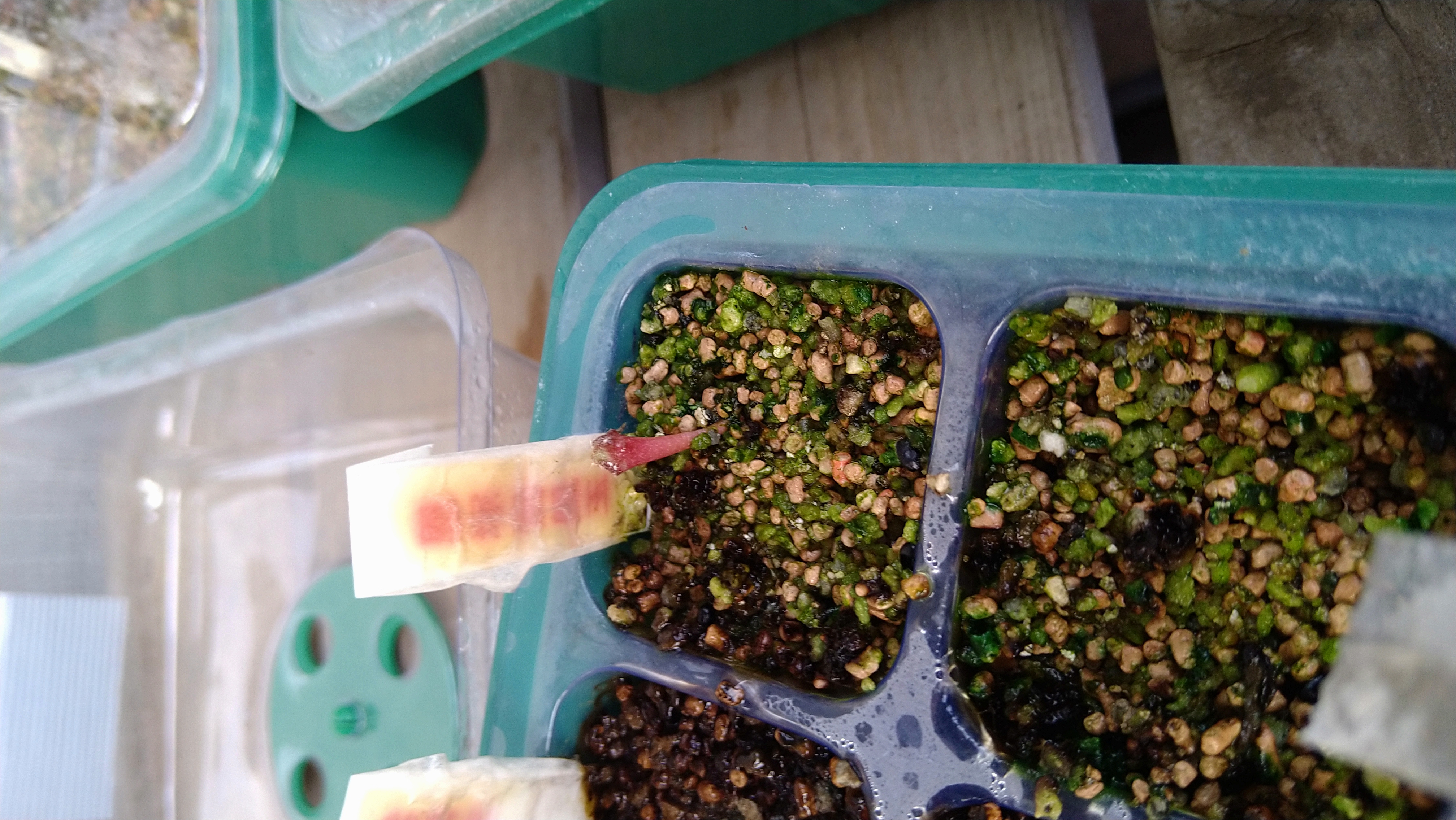 ・蓋付きプラケースで腰水管理、朝夕ベンレート1000倍+メネデール100倍溶液を噴霧