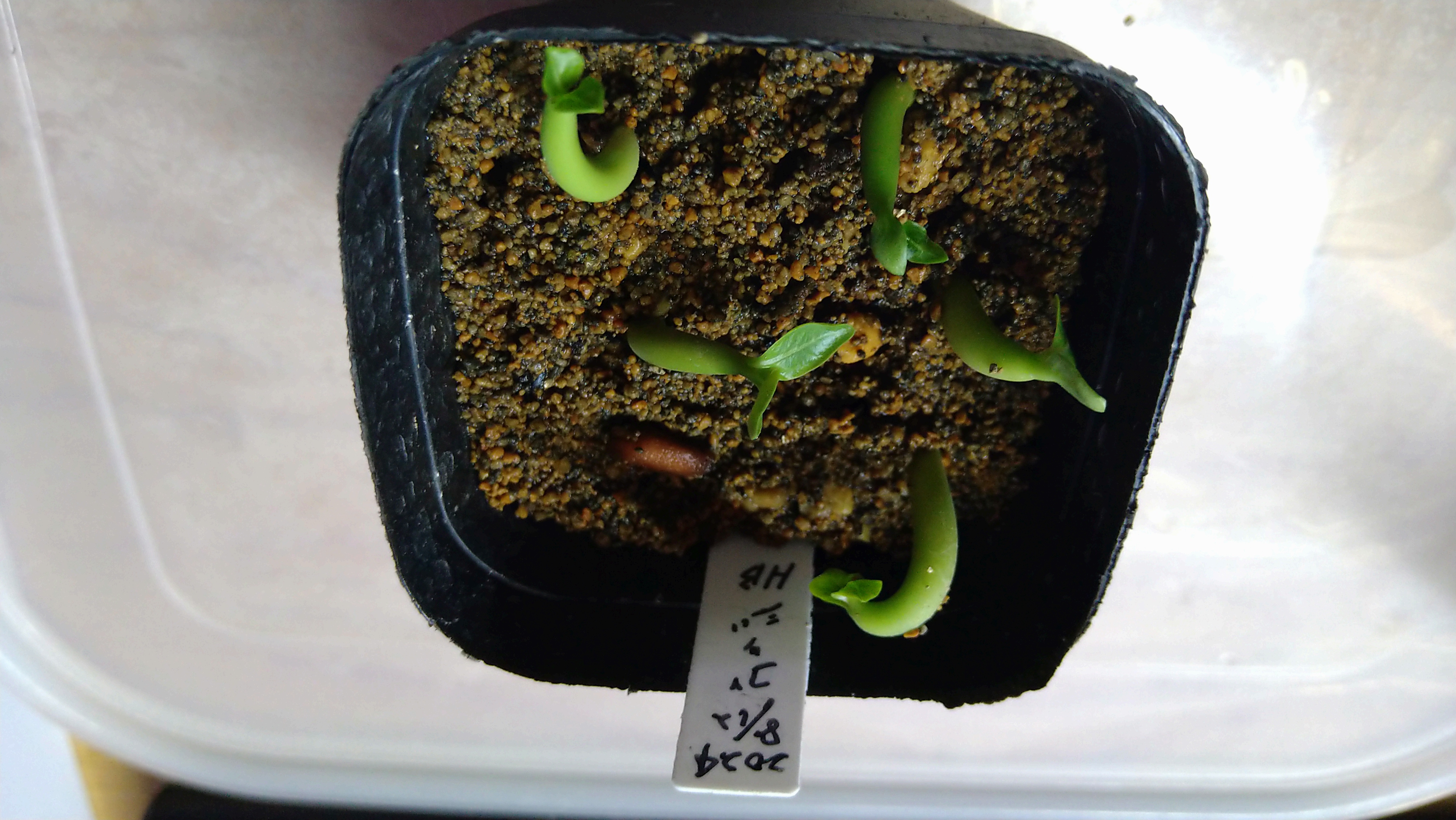 ・赤玉小粒50%桐生砂20%硬質鹿沼土小粒10%軽石10%バーミキュライト10%の用土を熱湯消毒の後、粗熱が覚めてから播種