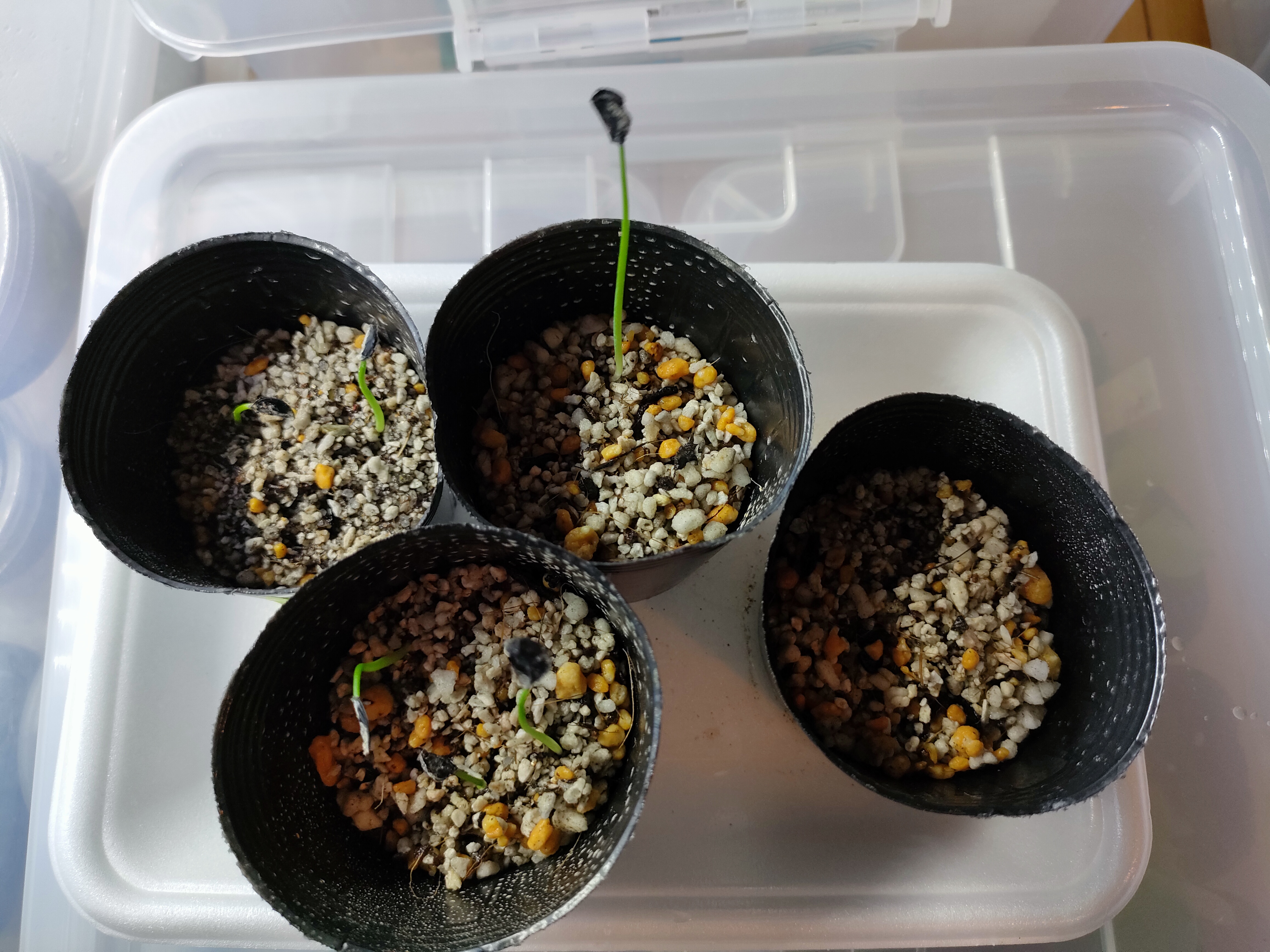 [ 播種日 / 撮影日 ]2024/8/16播種 2024/8/26撮影[ 播種数 / 発芽数 ]12粒/ 6粒[ その他(用土や管理方法など)]播種前にメネデール溶液に1.5日程度浸漬サボテン培養土に播種