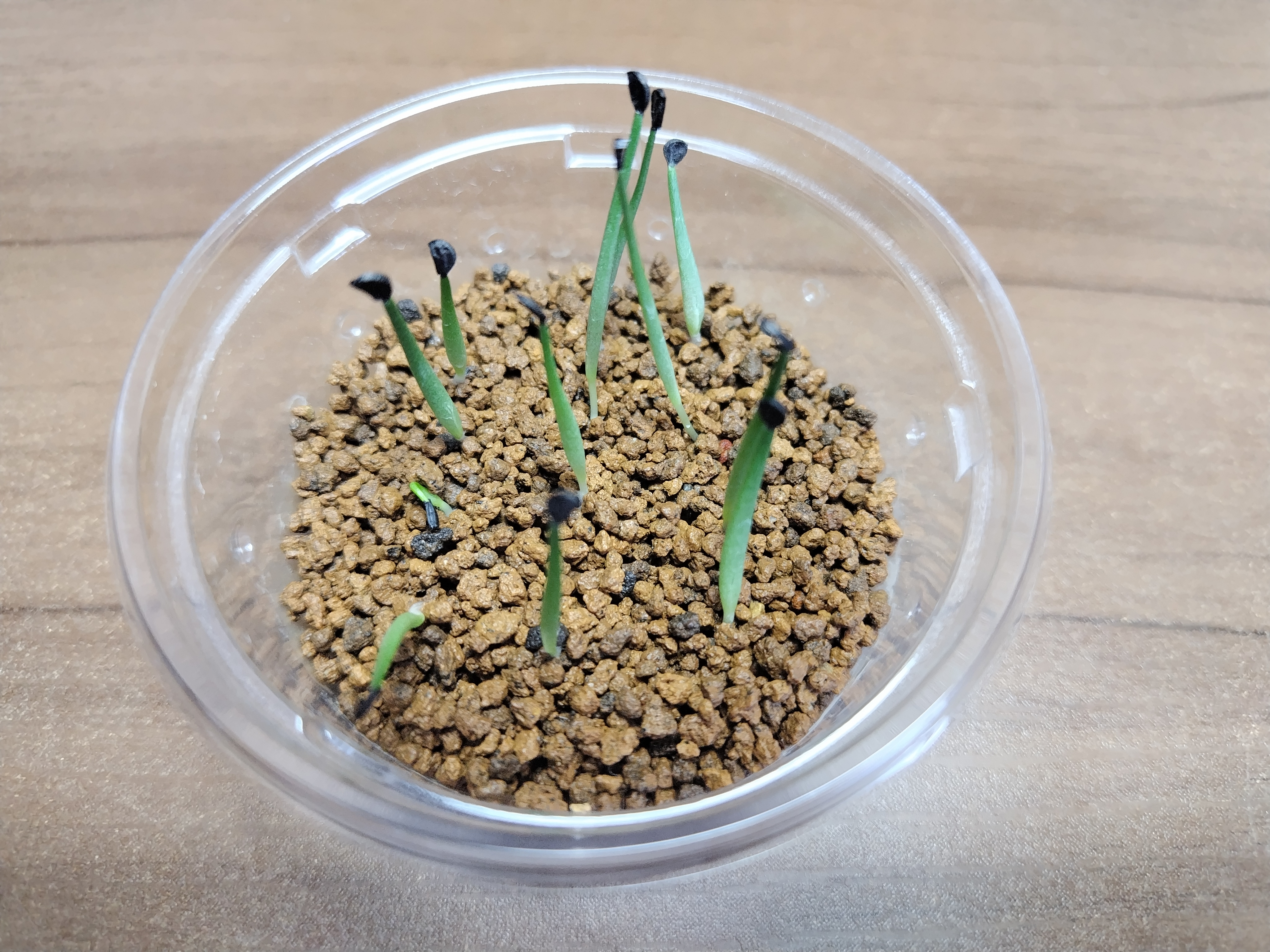 メネデールとベンレートを混ぜた液体に12時間以上漬ける。赤玉土に播種。発芽後にポットへ植え替える予定のため蓋のできるカップを使用。メネデール+ベンレートの溶液で湿らせる。赤玉土は事前に熱湯で殺菌消毒済み。