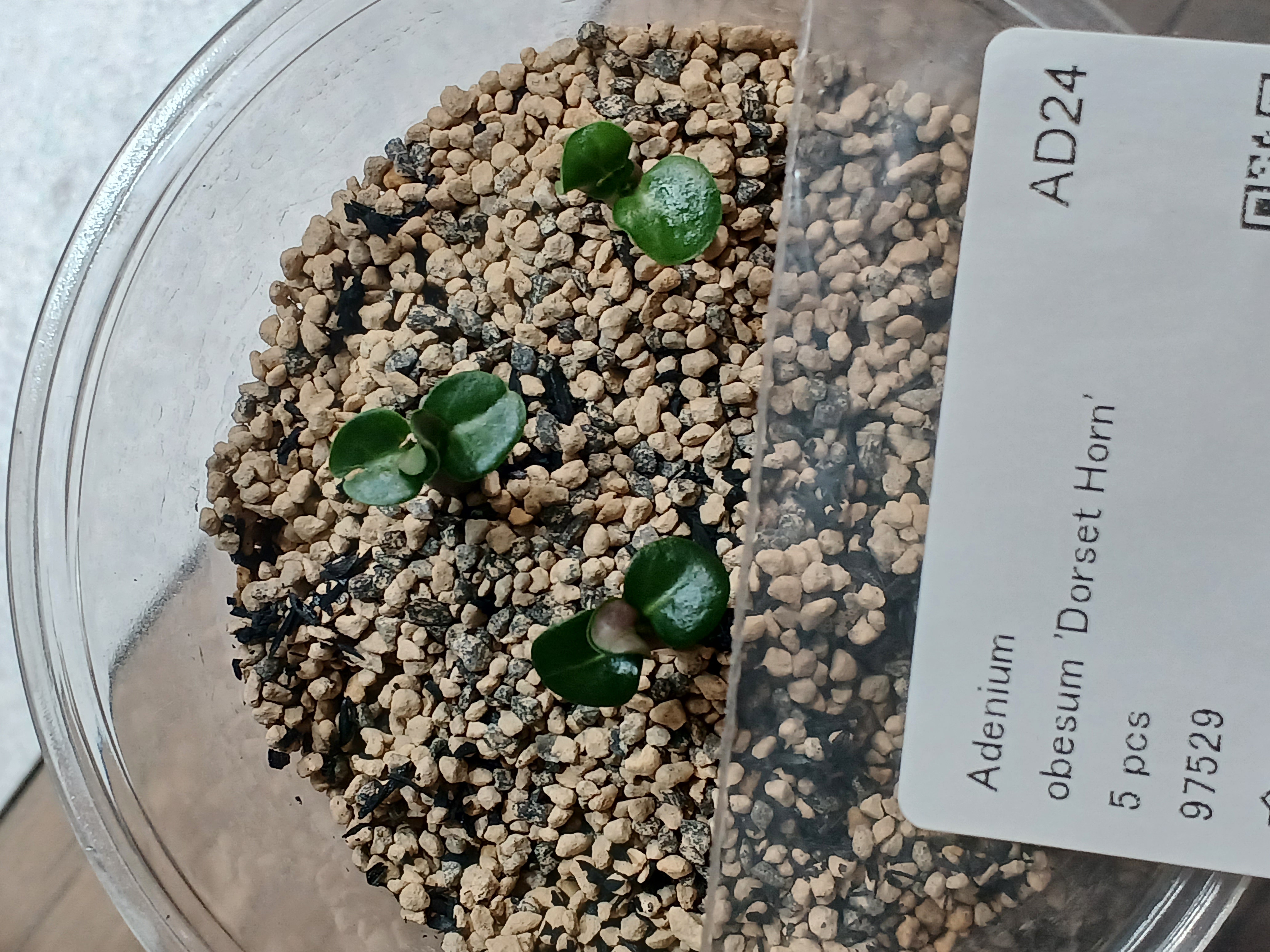[ 撮影日 ] 2024/9/6撮影、播種から約20日[ 播種数 / 発芽数 ]6粒/ 3粒[ その他(用土や管理方法など)]播種前の処置は特になし。細目のボラ土にもみ殻くん炭を少しまぜ、根が潜りやすいよう種を軽く押し付け半分程度埋めて播種、25度~29度、LED、腰水で管理。