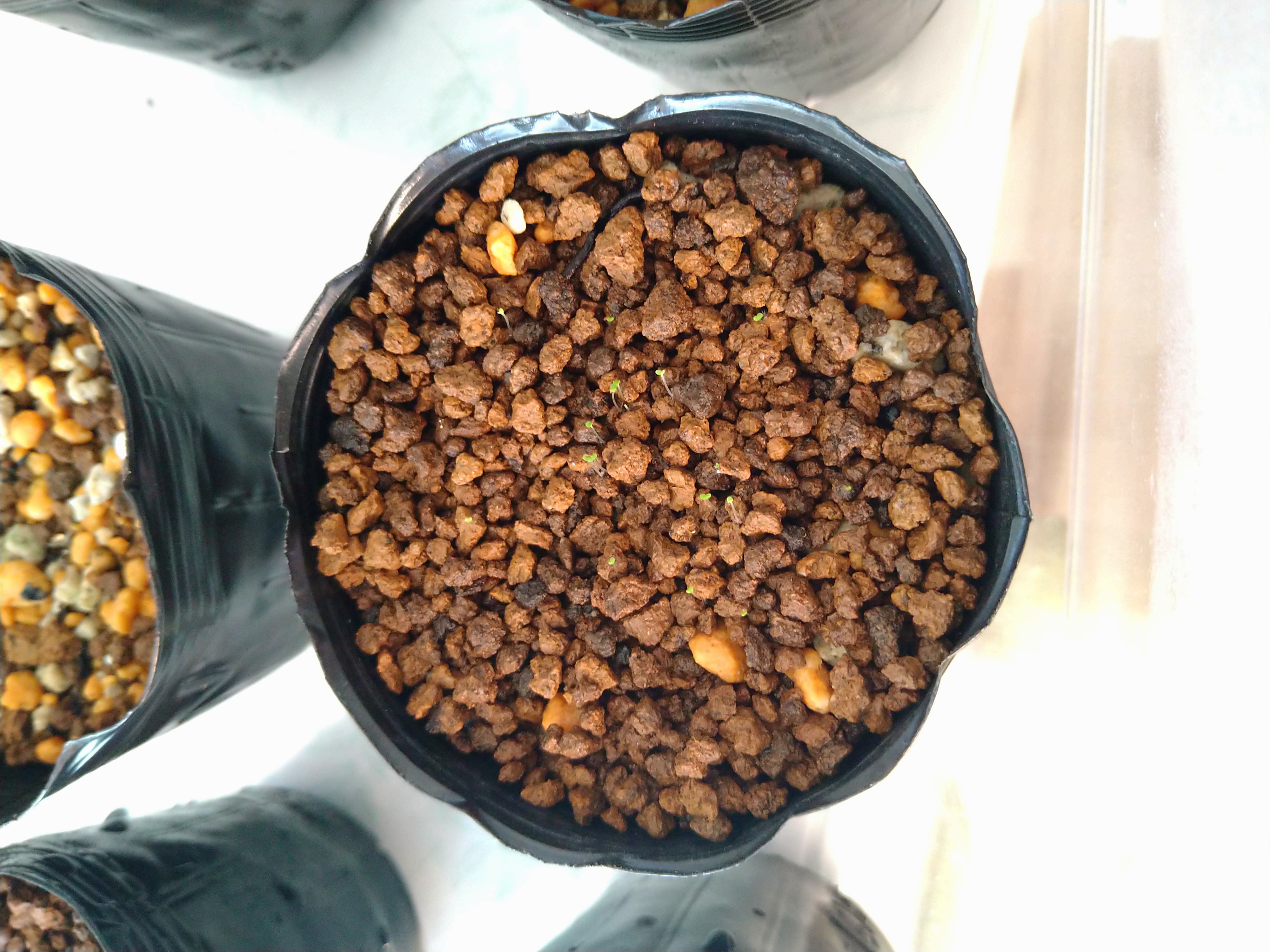 赤玉、鹿沼、軽石の用土の上に赤玉小粒を敷き詰めその上に播種。