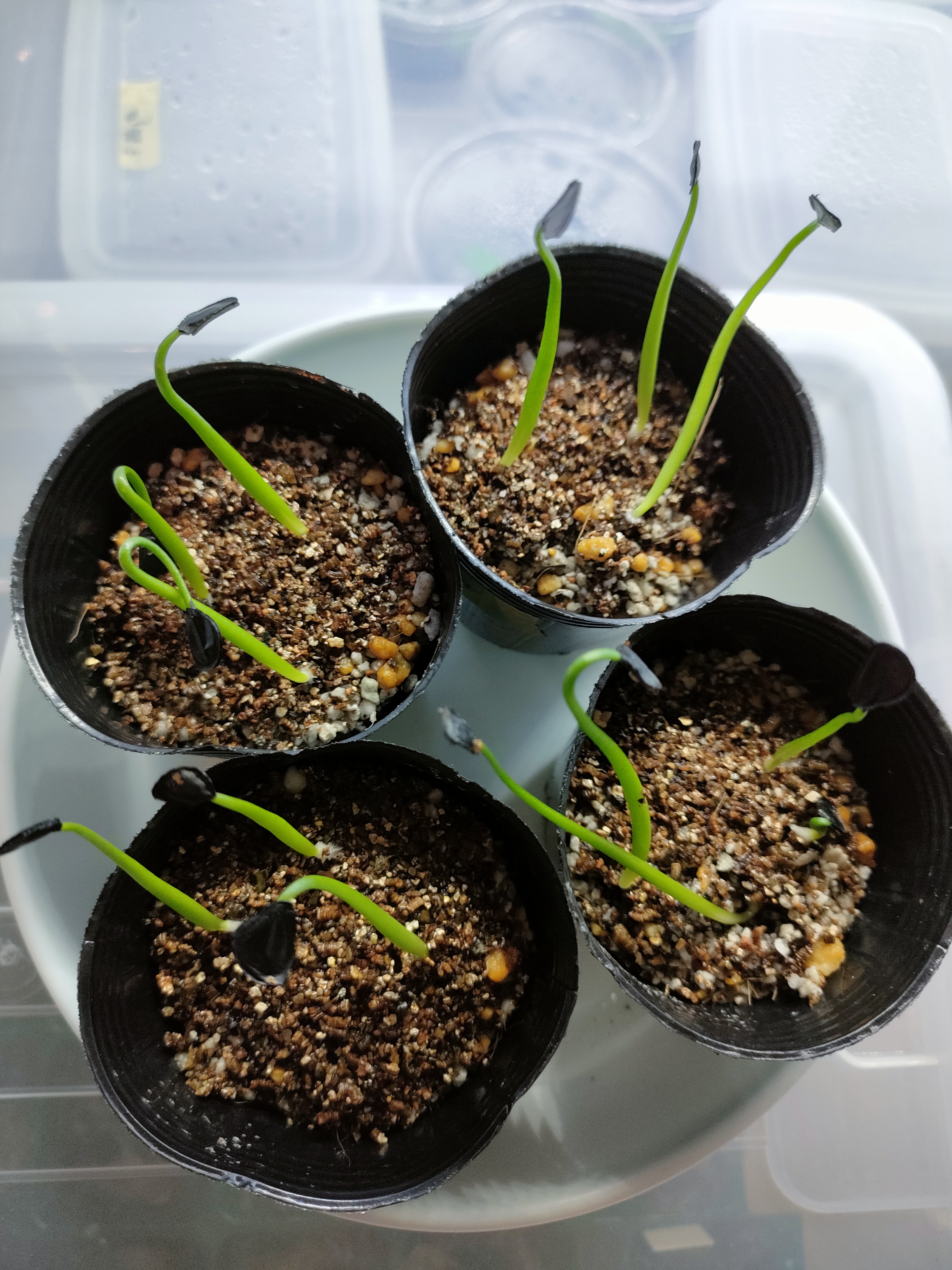 [ 播種日 / 撮影日 ]2024/8/31播種 2024/9/8撮影[ 播種数 / 発芽数 ]13粒/ 13粒[ その他(用土や管理方法など)]播種前にメネデール溶液に2日程度浸漬サボテン培養土に播種