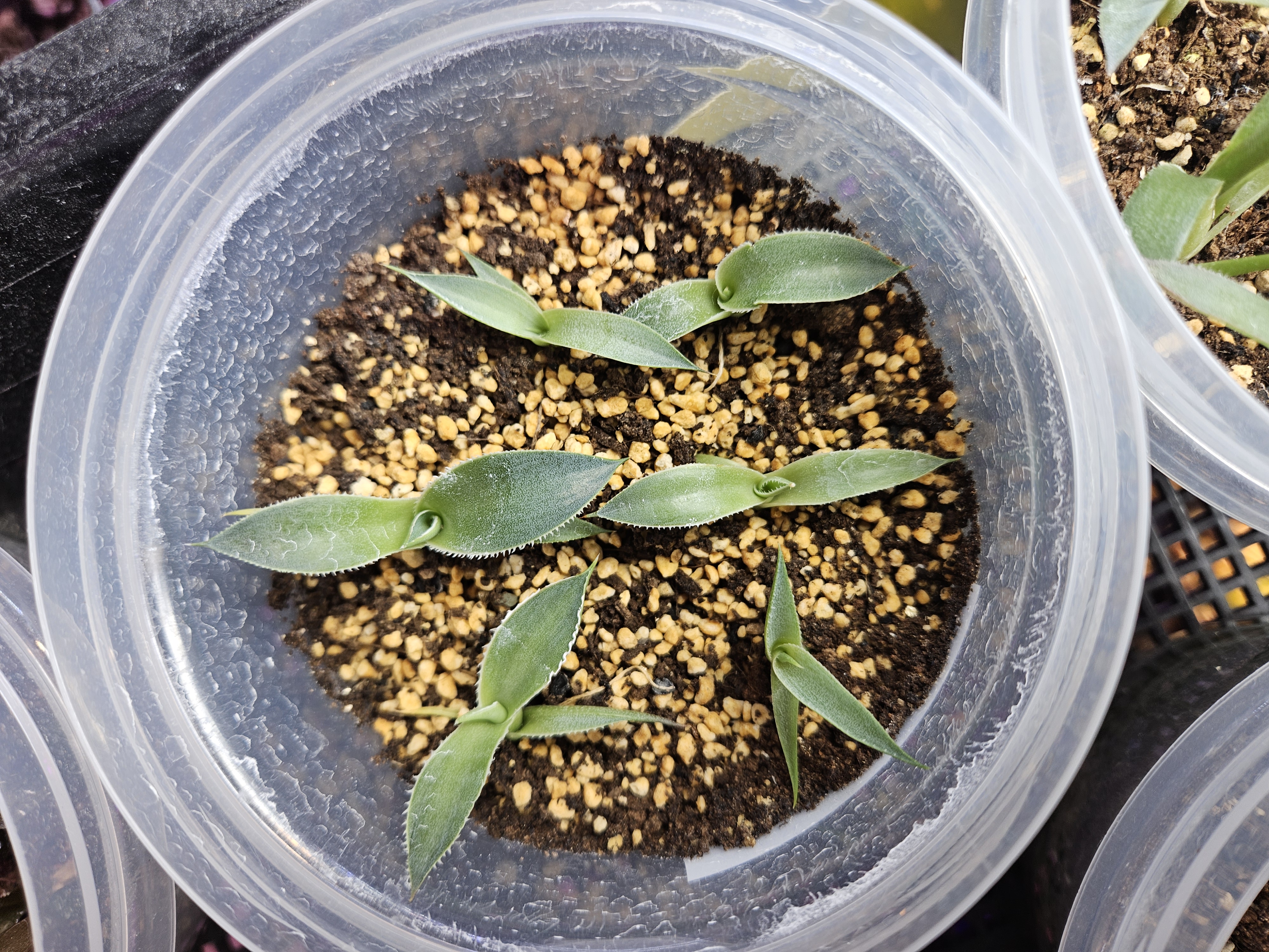 はじめの一ヶ月は、水で用土を濡らしてからダコニール1000倍希釈液を上からスプレーして、3mm程の穴を3ヵ所あけた蓋をして放置。カビてきたら再度ダコニール1000倍をスプレー。