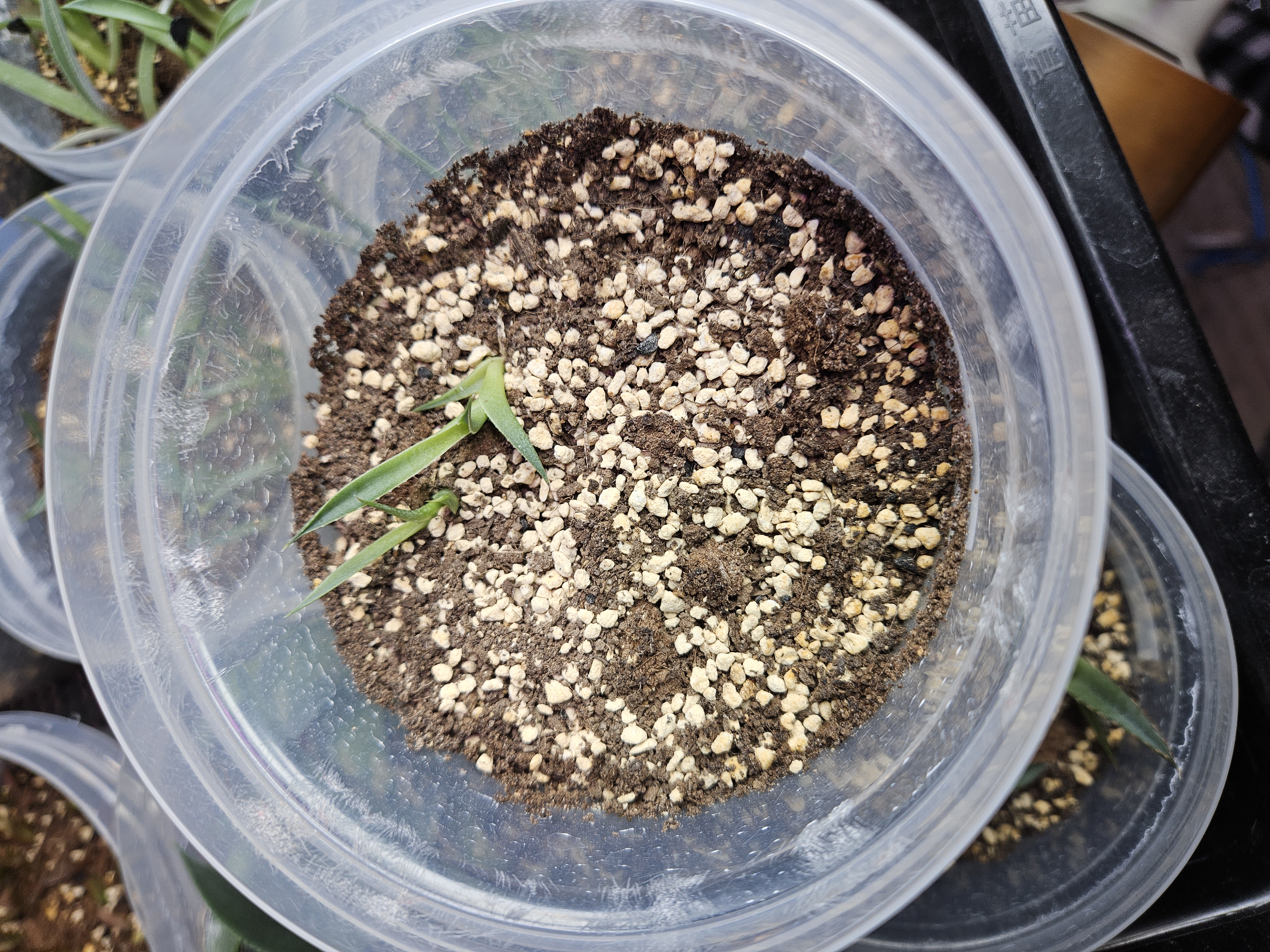 はじめの一ヶ月は、水で用土を濡らしてからダコニール1000倍希釈液を上からスプレーして、3mm程の穴を3ヵ所あけた蓋をして放置。カビてきたら再度ダコニール1000倍をスプレー。