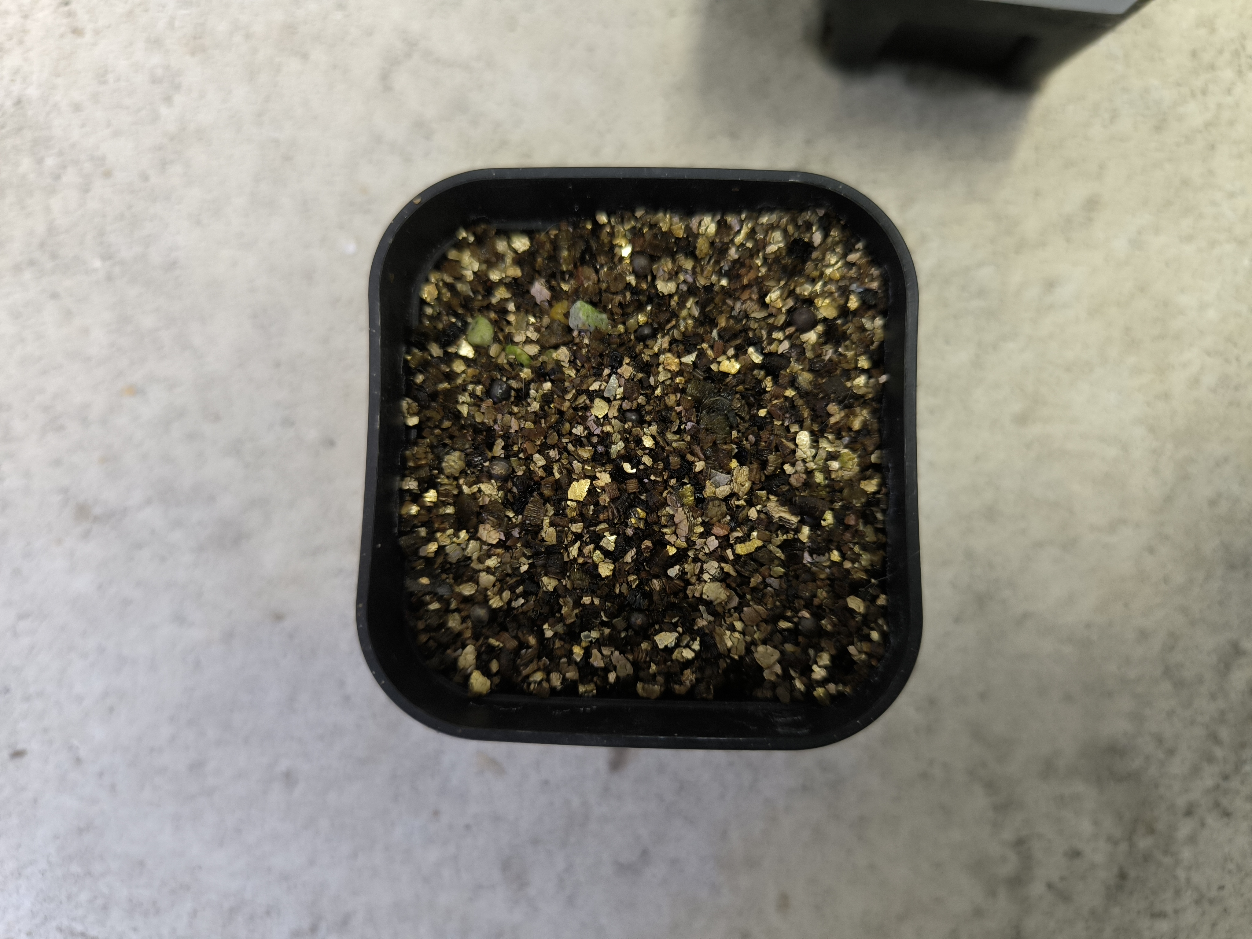 小粒の軽石、鹿沼土、赤土を1:1:1で配合した培養土に保湿用のバーミキュライトを薄く敷き詰め、その上に種(播種前に半日程メネデール浸水)を置いて東向きの日向で腰水管理。
