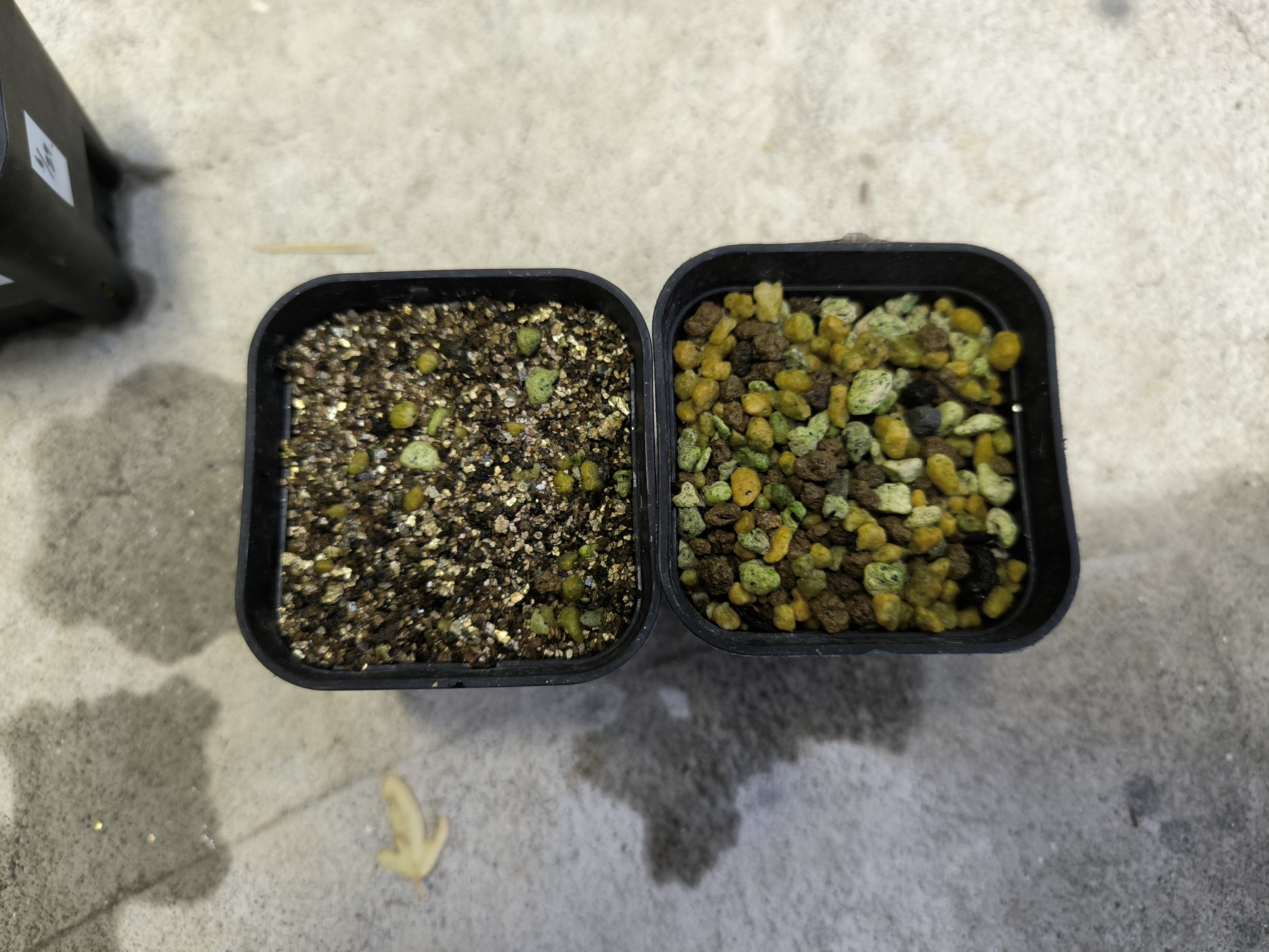 小粒の軽石、鹿沼土、赤土を1:1:1で配合した培養土の鉢と、左記培養土の表面にバーミキュライトを敷いた鉢の2種類の鉢に播種し、東向きの日向で腰水管理。