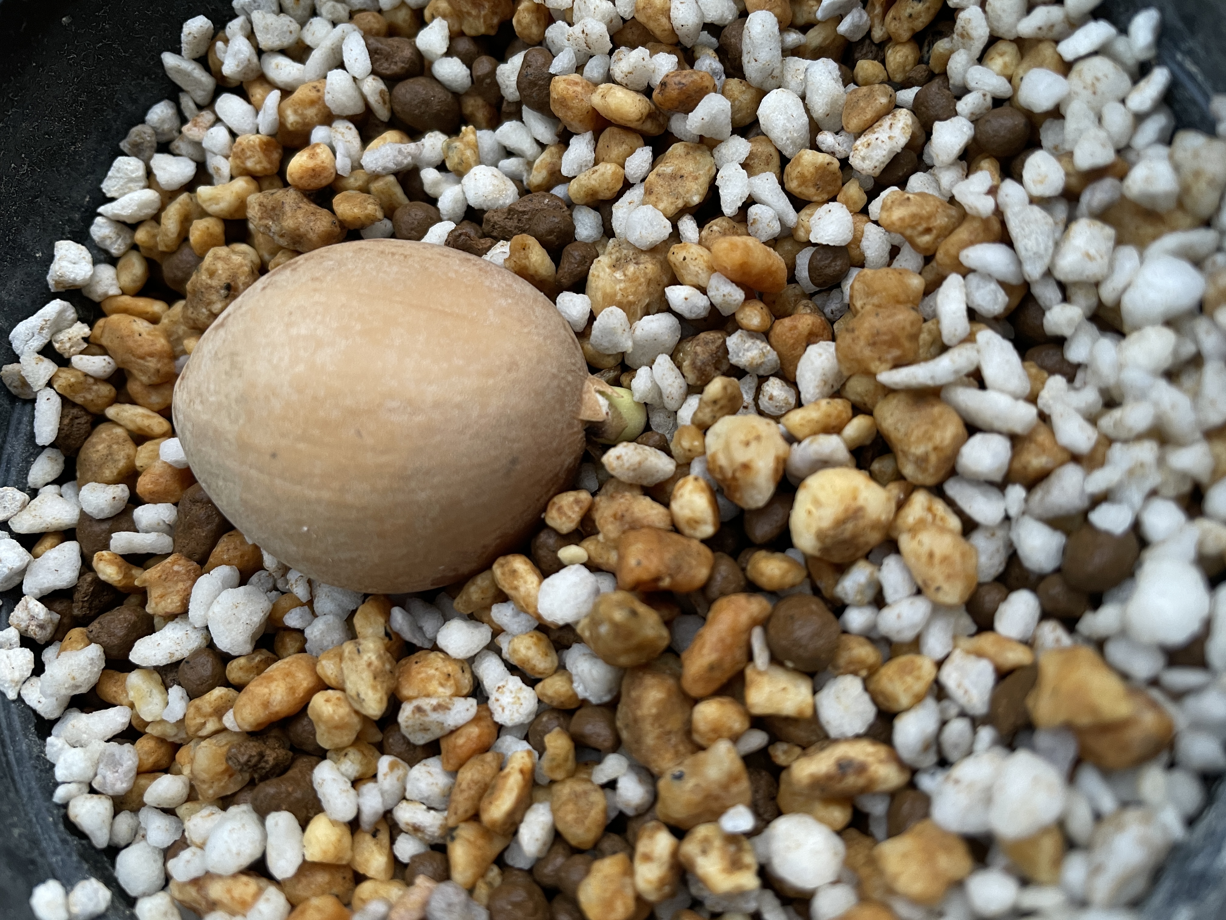[ 播種日 / 撮影日 ]2024/9/15播種 2024/10/10撮影[ 播種数 / 発芽数 ]1粒/ 1粒[ 用土や管理方法など]播種前に2時間水に付けた。