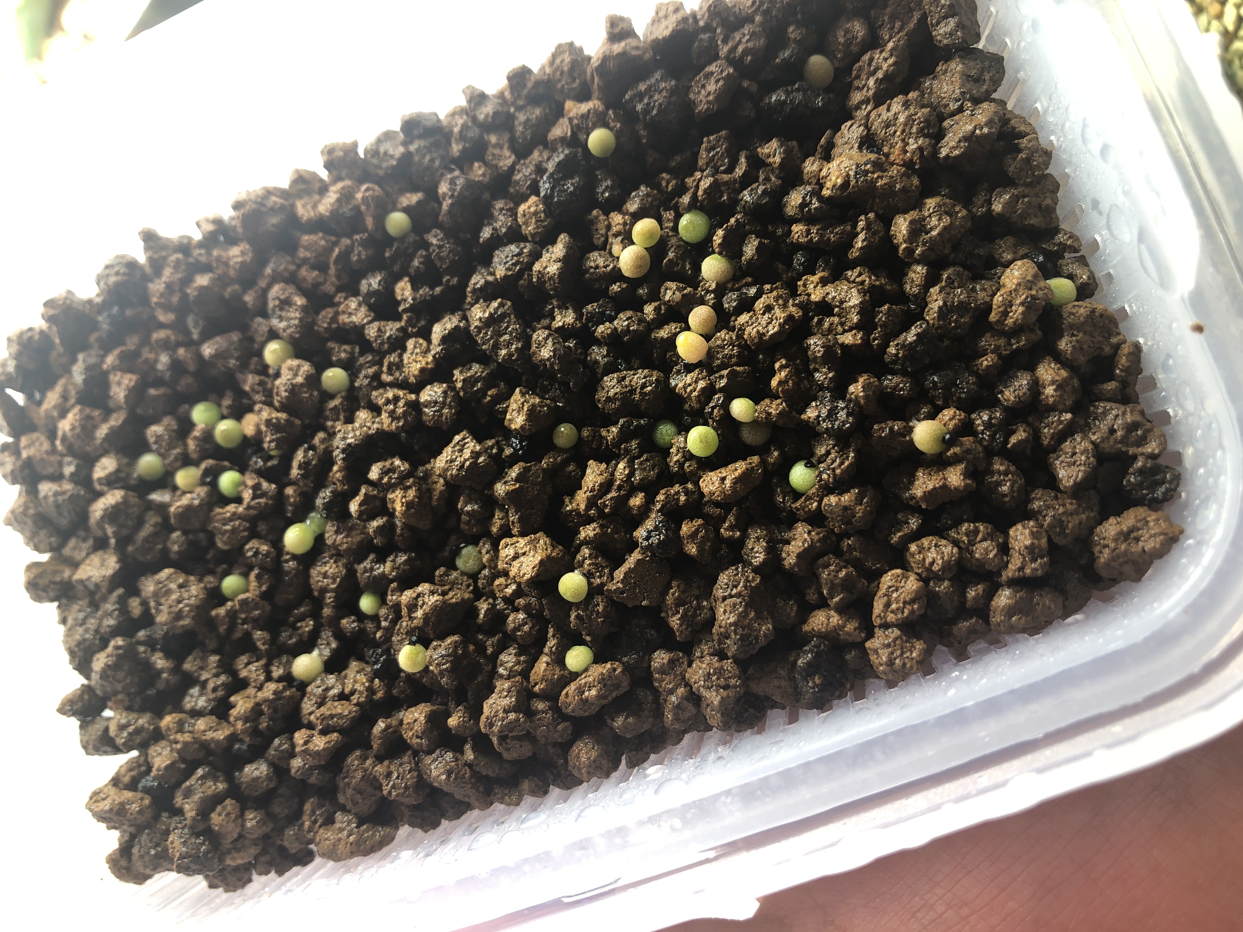 2024/10/12現在 二週間前に播種37粒/ 50粒発芽容器はザル付きタッパー 蓋に穴を開けたもの。用土は赤玉小粒のみ。