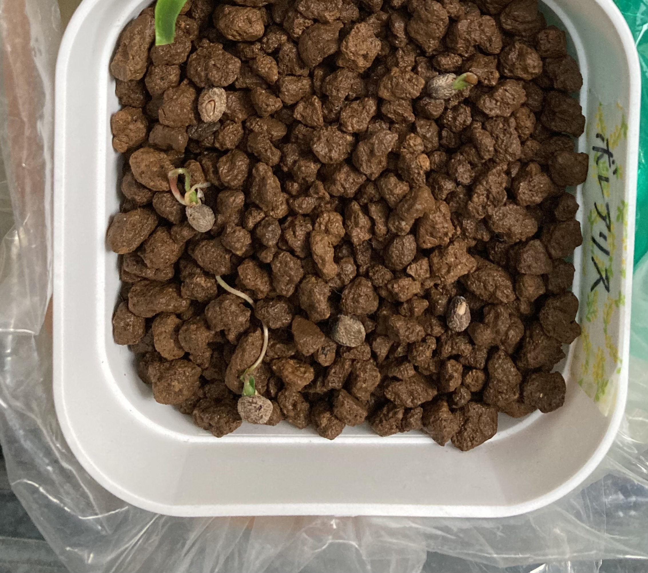 [ 播種日 / 撮影日 ]2024/9/7播種 2024/9/22撮影[ 播種数 / 発芽数 ]10粒/ 3粒[ その他(用土や管理方法など)]つばさブログを参考に、播種前にジベレリン溶液に6時間程度浸漬し、蓋開け後に水に30分浸漬し、中粒の赤玉土に置いた。