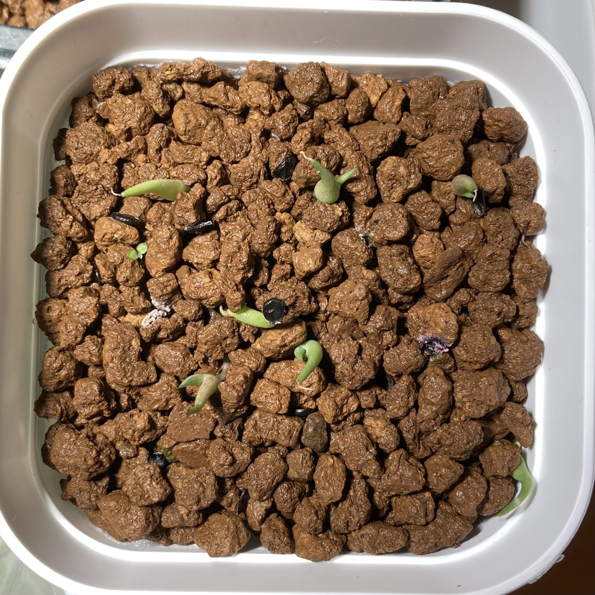 [ 播種日 / 撮影日 ]2024/9/7播種 2024/10/13撮影[ 播種数 / 発芽数 ]12粒/ 8粒[ その他(用土や管理方法など)]何もせず中粒の赤玉土に播種し、日当たりよく雨ざらしになる軒先にて腰水管理。