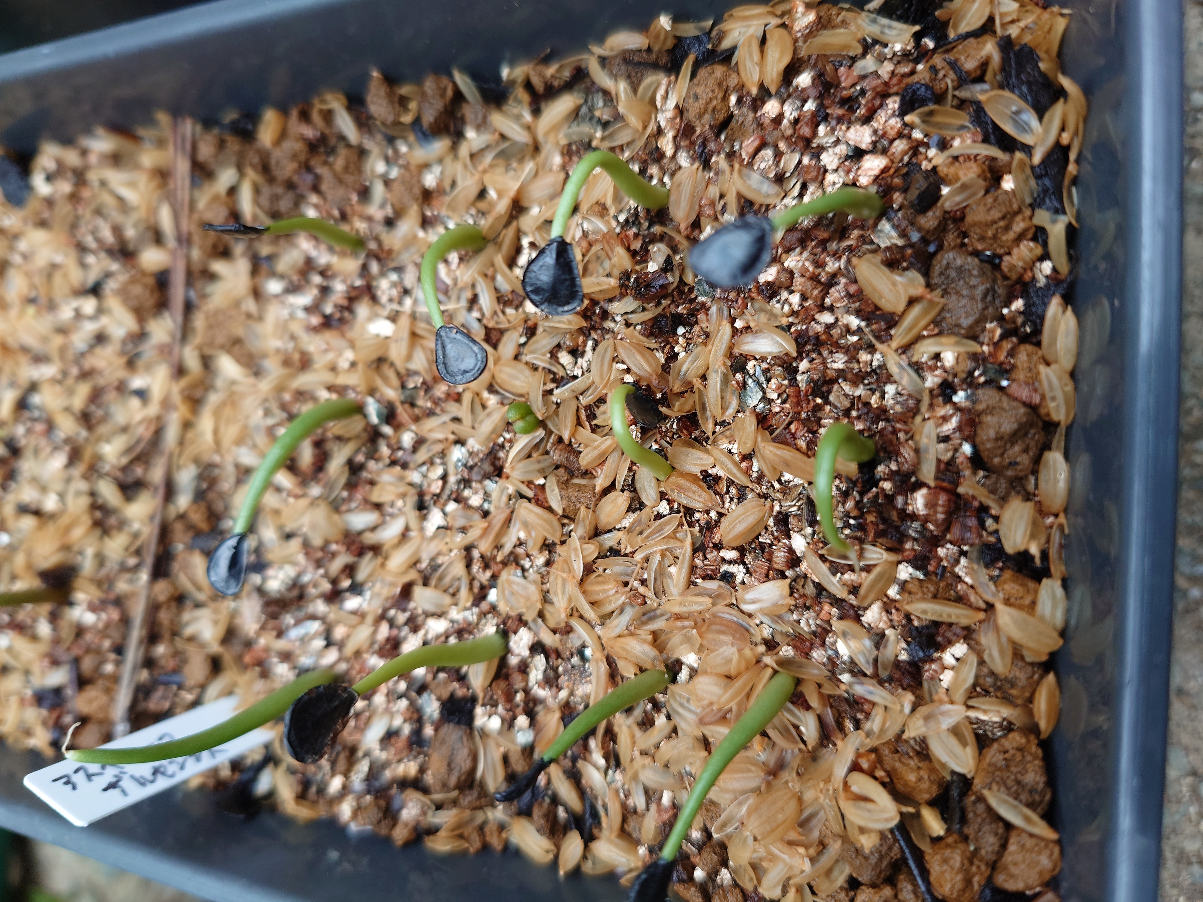 ・播種した種は、 バーミキュライトで薄く覆土し、籾殻を軽く撒いておく。