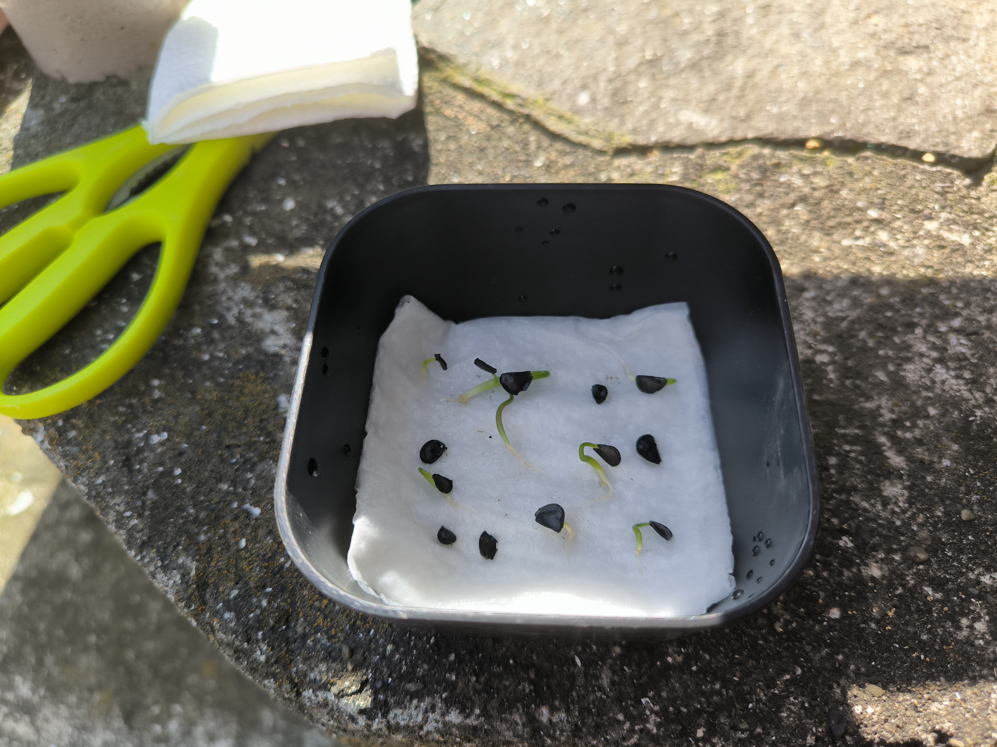 湿らせたキッチンペーパーの上に蒔き、1日2回程霧吹きで加湿(フタ無し)。
