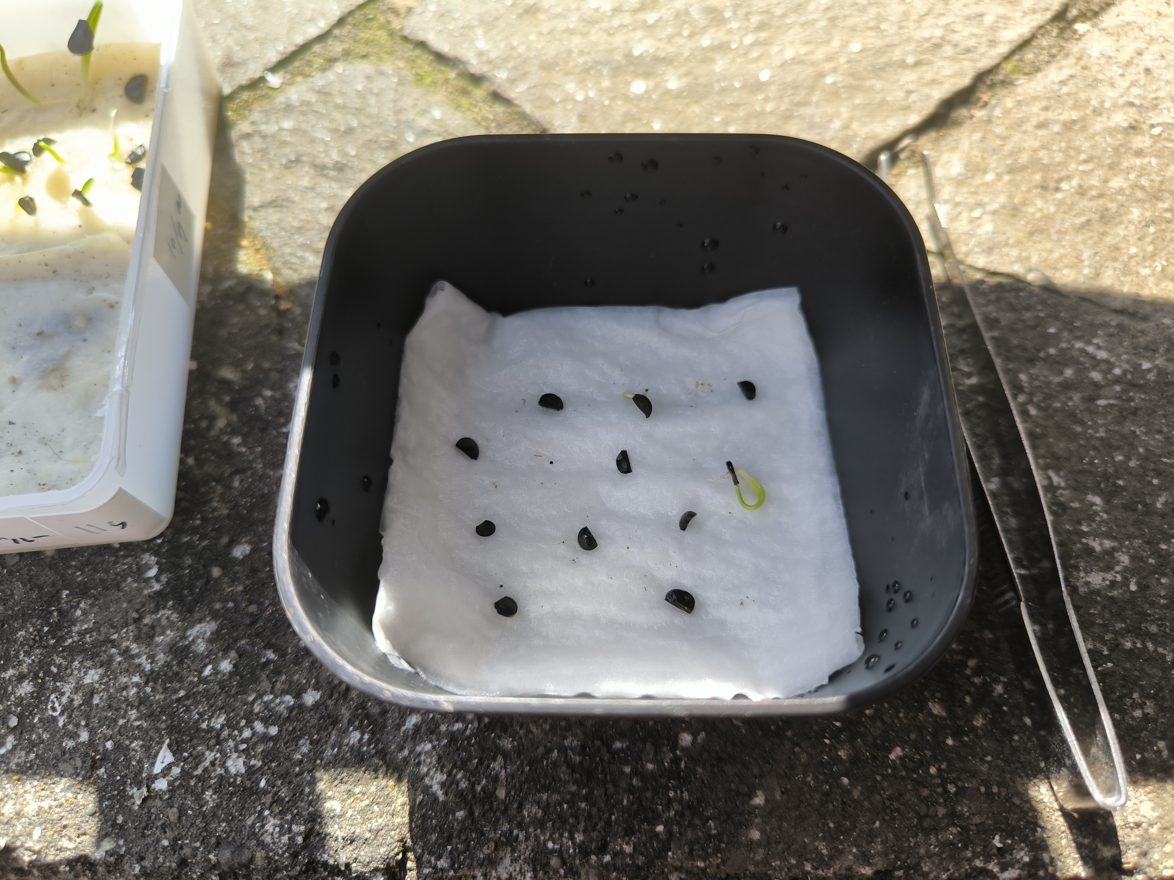 湿らせたキッチンペーパーの上に蒔き、1日2回程霧吹きで加湿(フタ無し)。