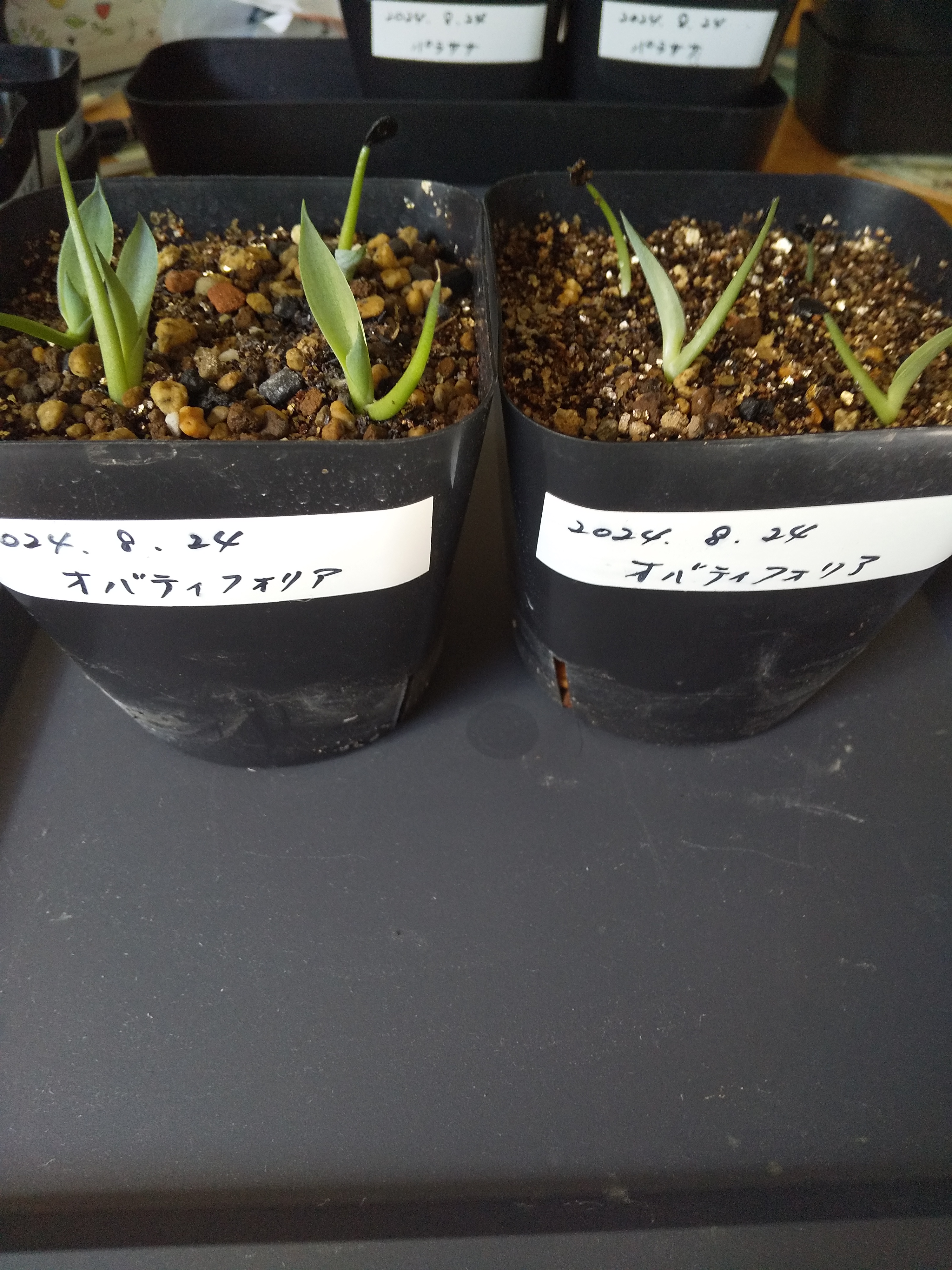 赤玉メインの用土に細目のバーミキュライトを敷き播種、腰水で管理