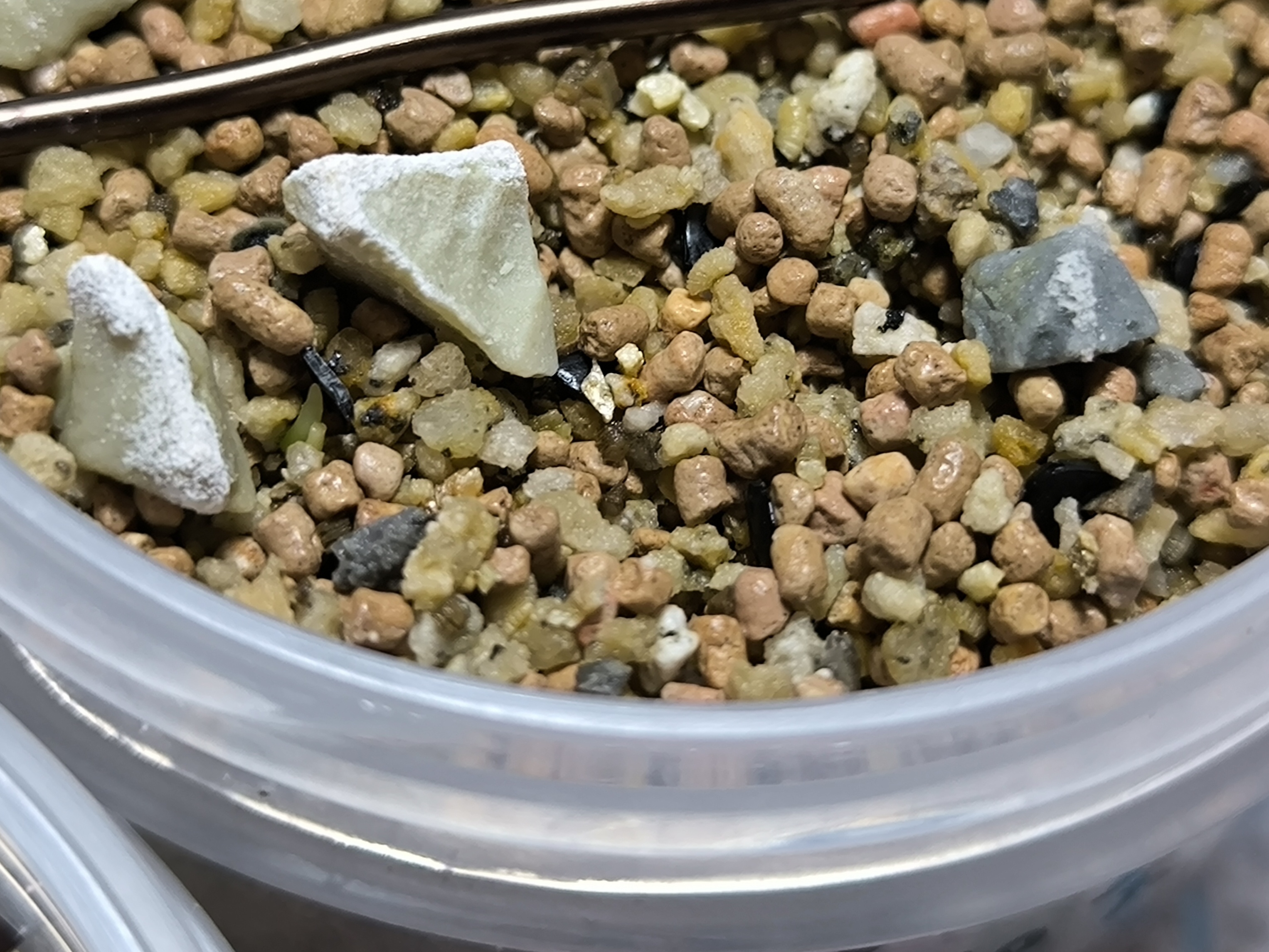 多肉植物用の無機用土と鉢底石代わりに少量の鹿沼土を入れた容器に播種。