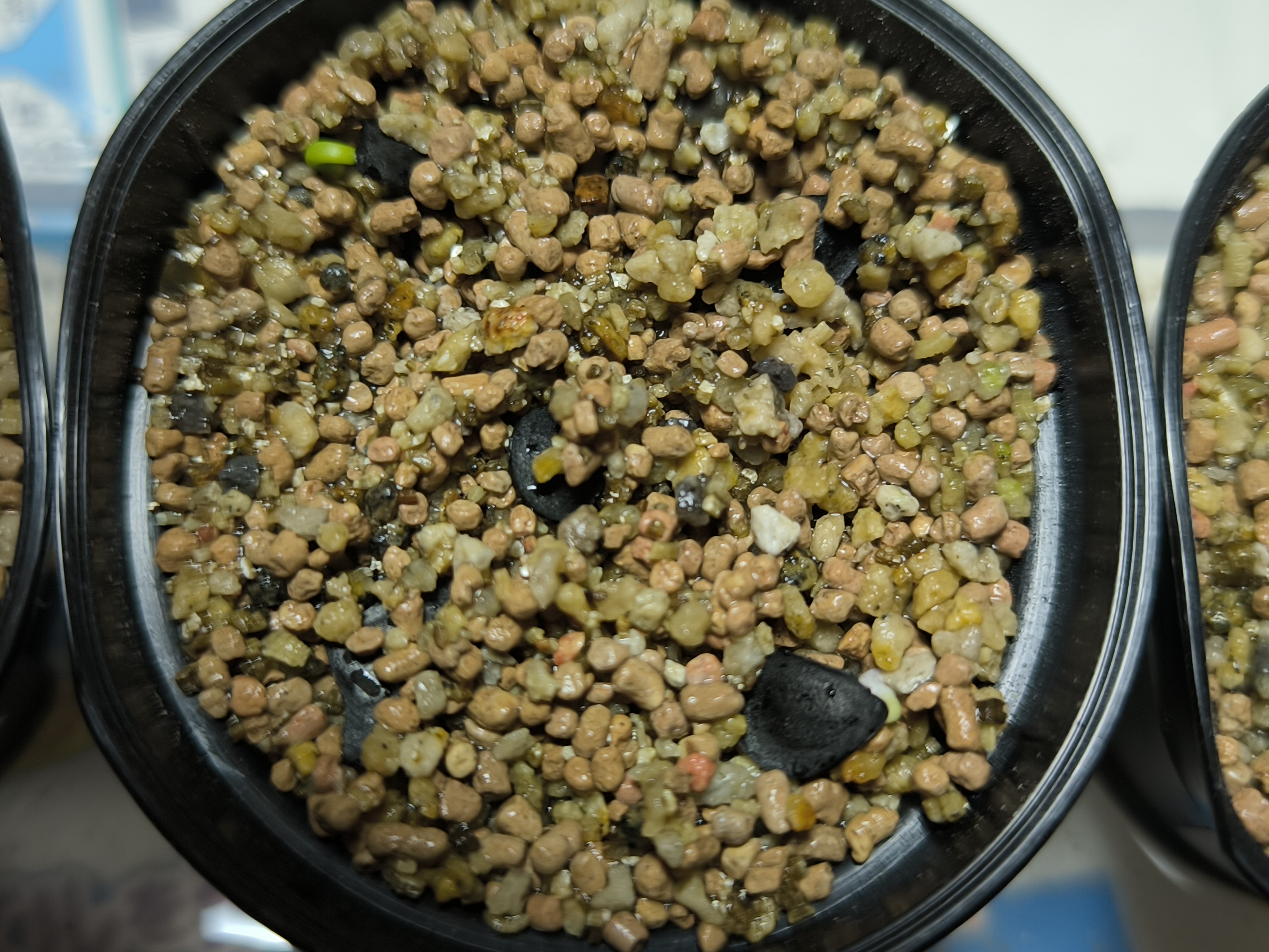 多肉植物用無機用土と鉢底石代わりの鹿沼土少量を入れた容器に播種。腰水管理。
