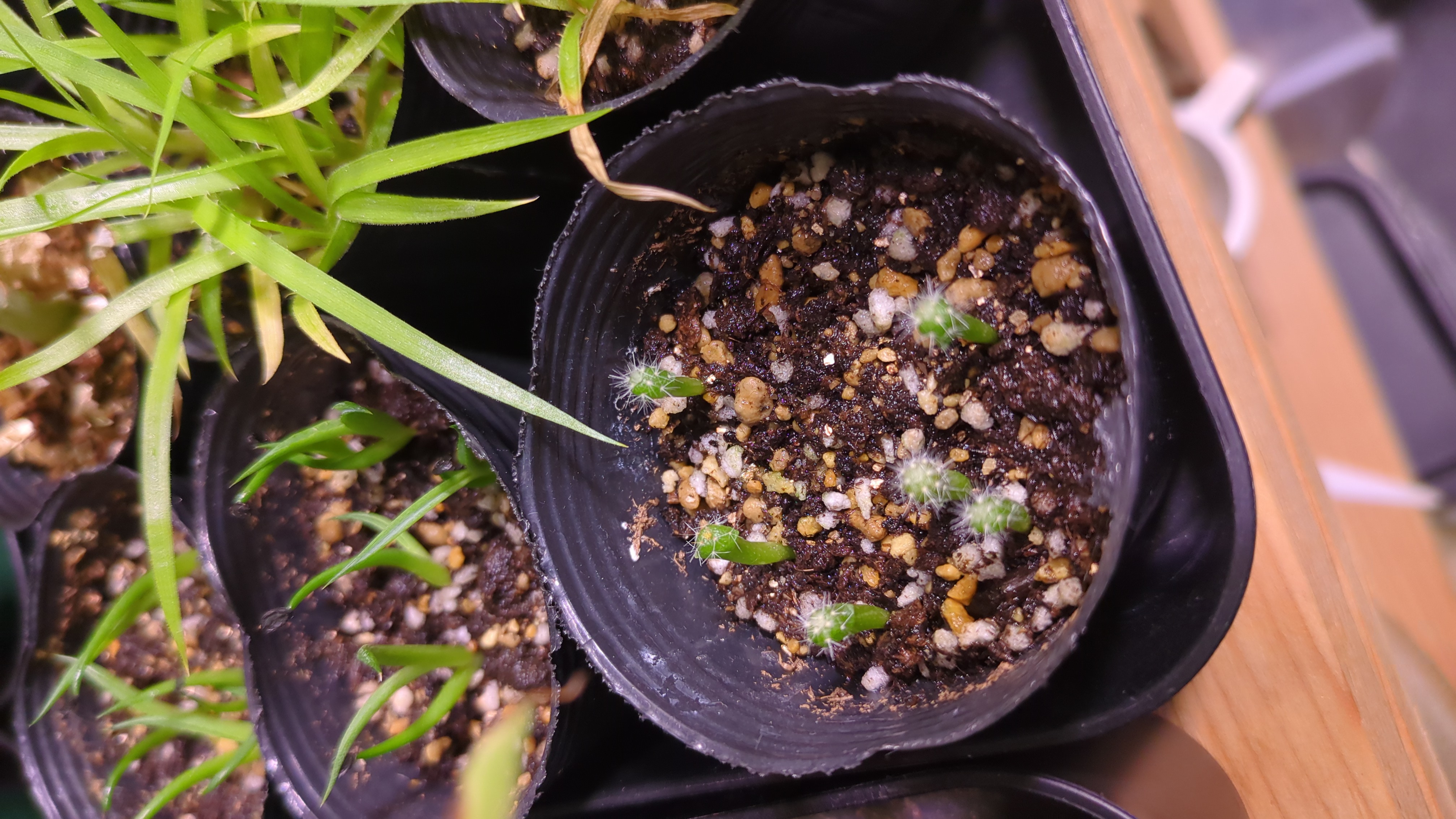 用土は下から軽石、赤玉土、市販の種まき用土の順