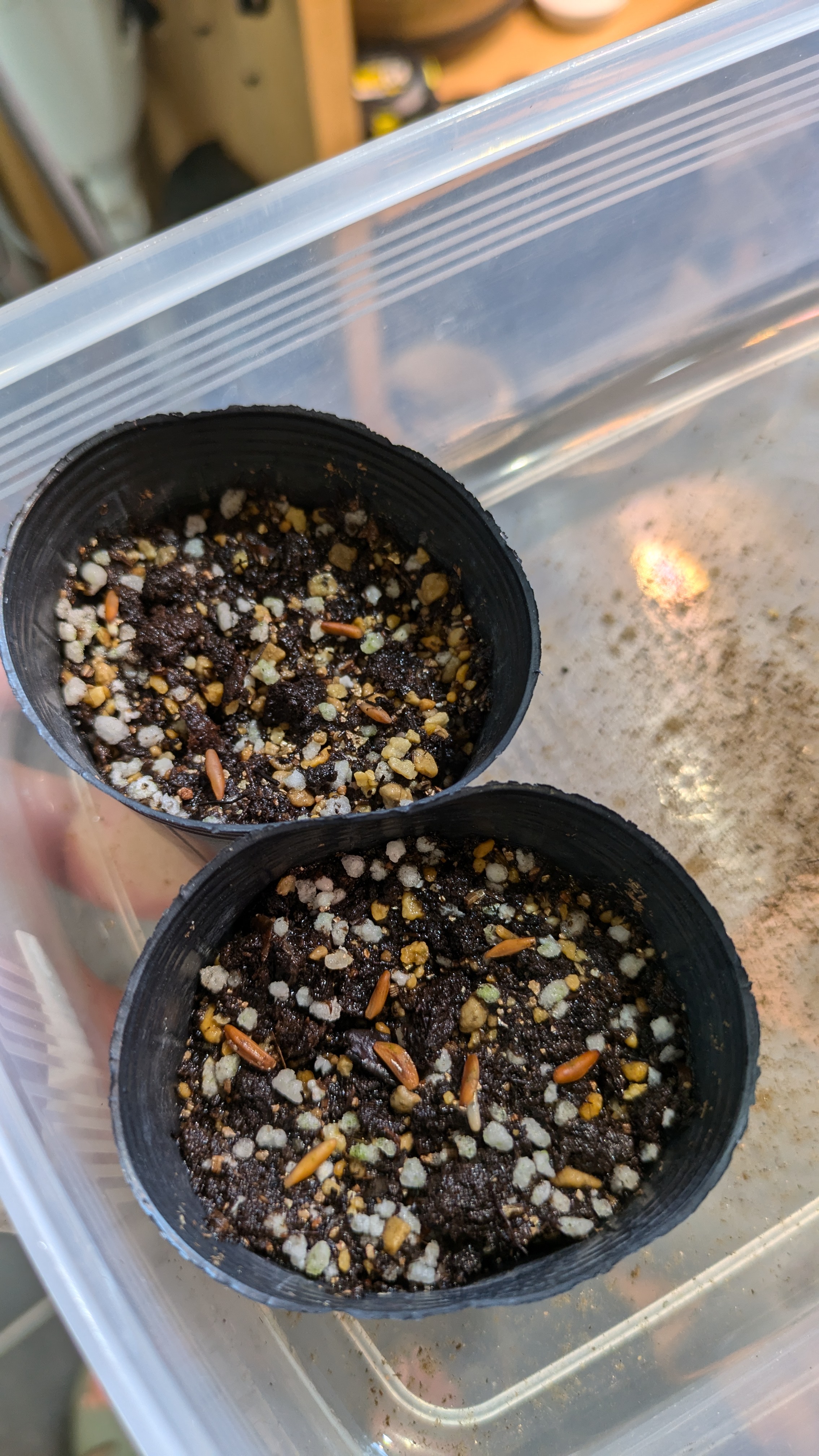 用土は下から軽石、赤玉土、市販の種まき用土の順