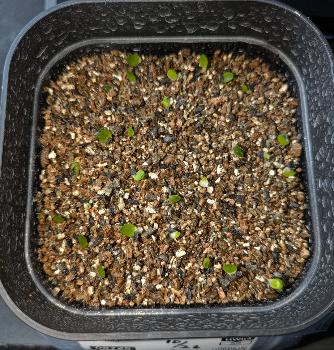 環境:室内管理。発芽までは100均の遮光ネットをかぶせてました。今はパネル型育成ライトから少し離れたところで管理中。光量は3000ルクスくらい