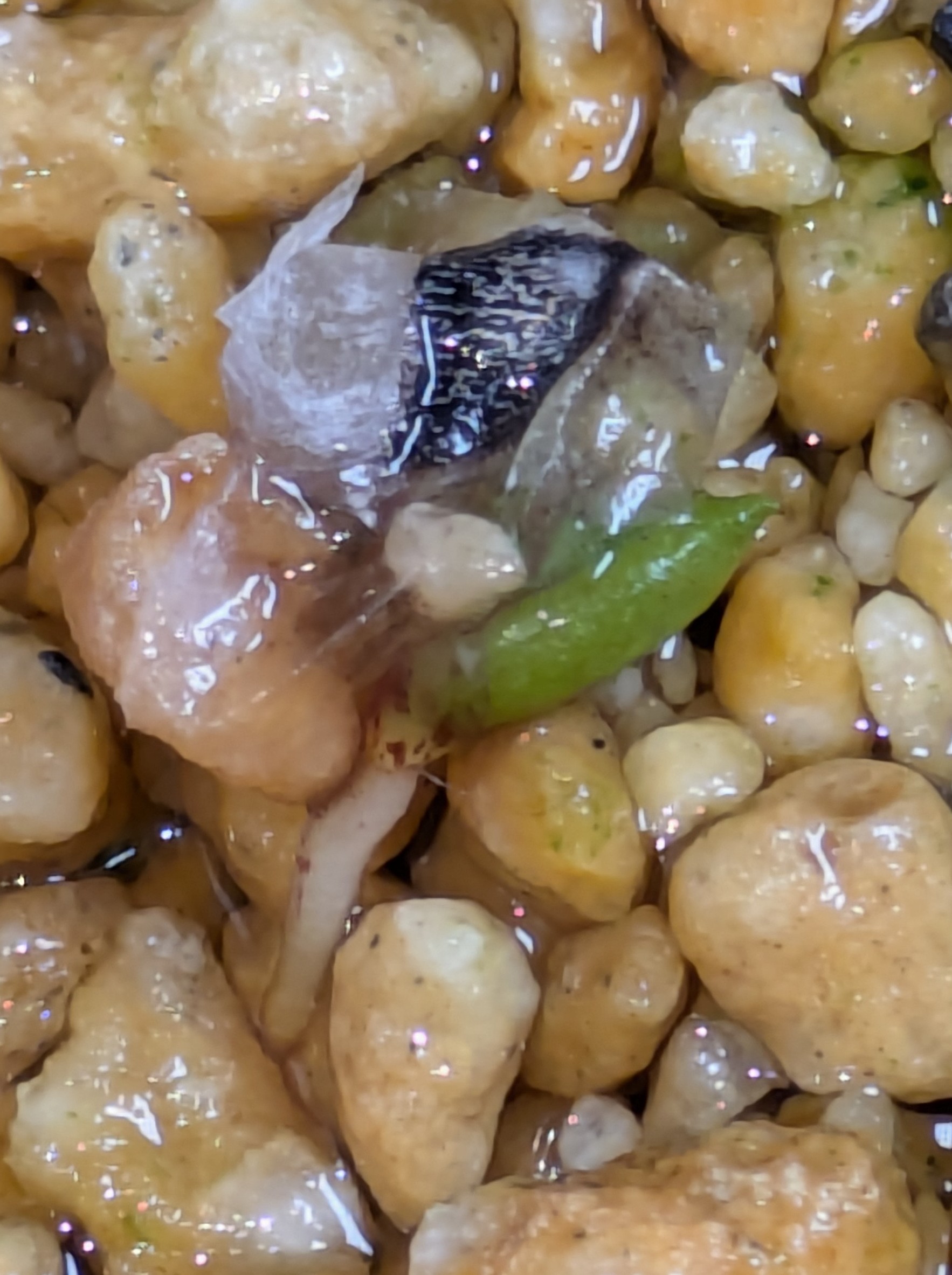腰水、鹿沼土中粒、小粒、プリムLEDパネルライト45ワット24時間照射。室内温度約20度です。