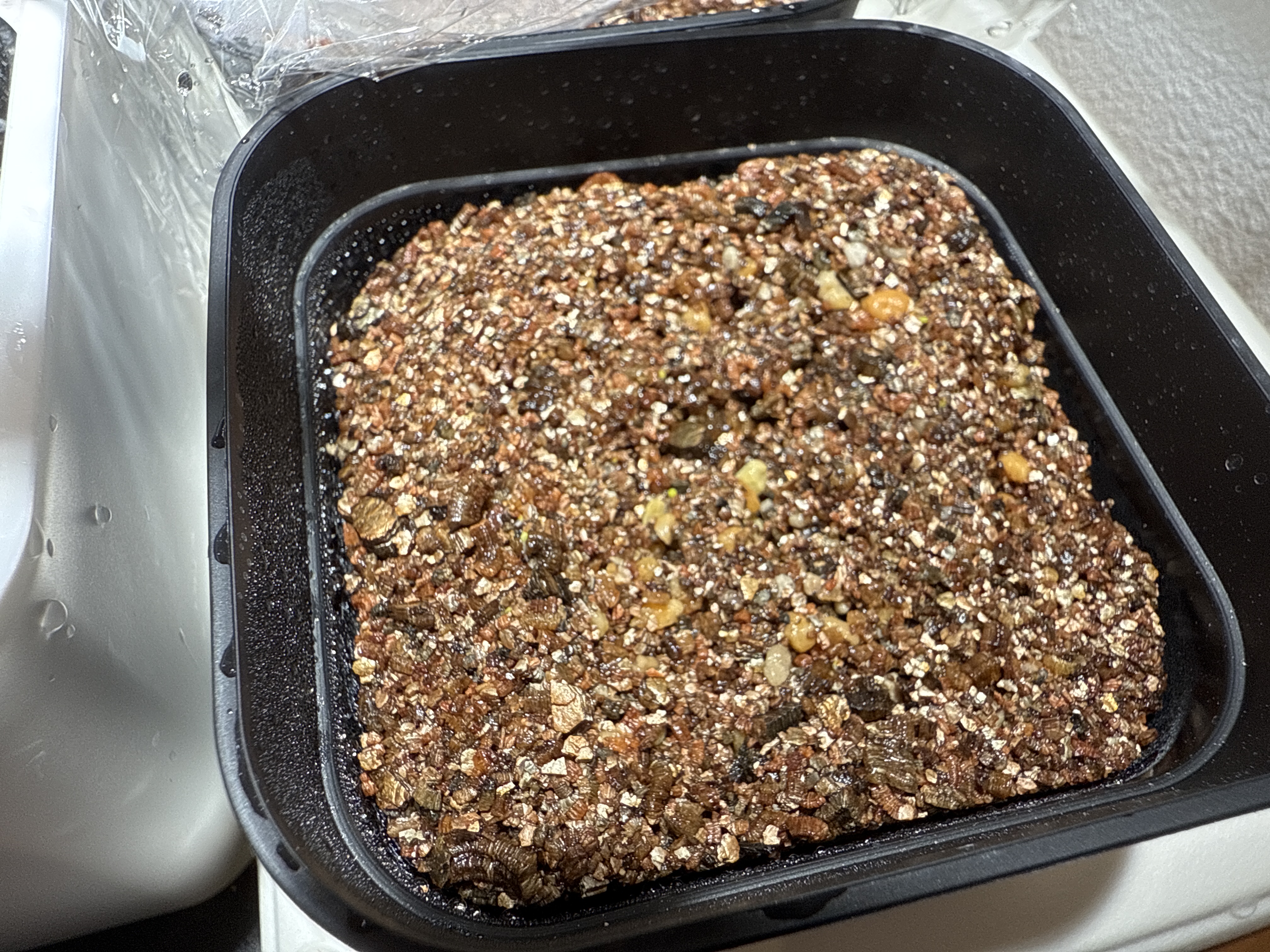 多肉植物用培養土に細目のバーミキュライトを敷き播種、表面ラップし20度〜25度で管理