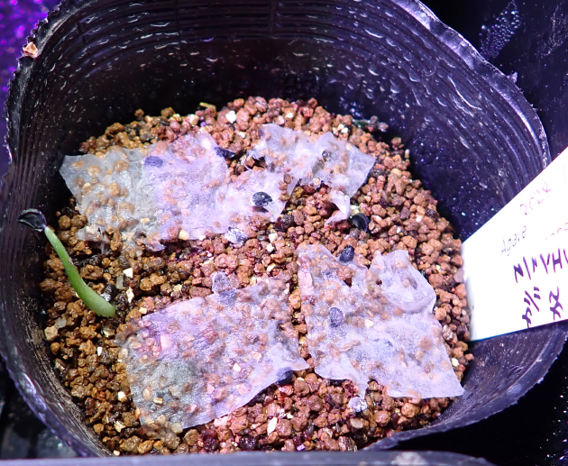 赤玉メインの用土に細目のバーミキュライトを敷き播種、24~30℃で管理