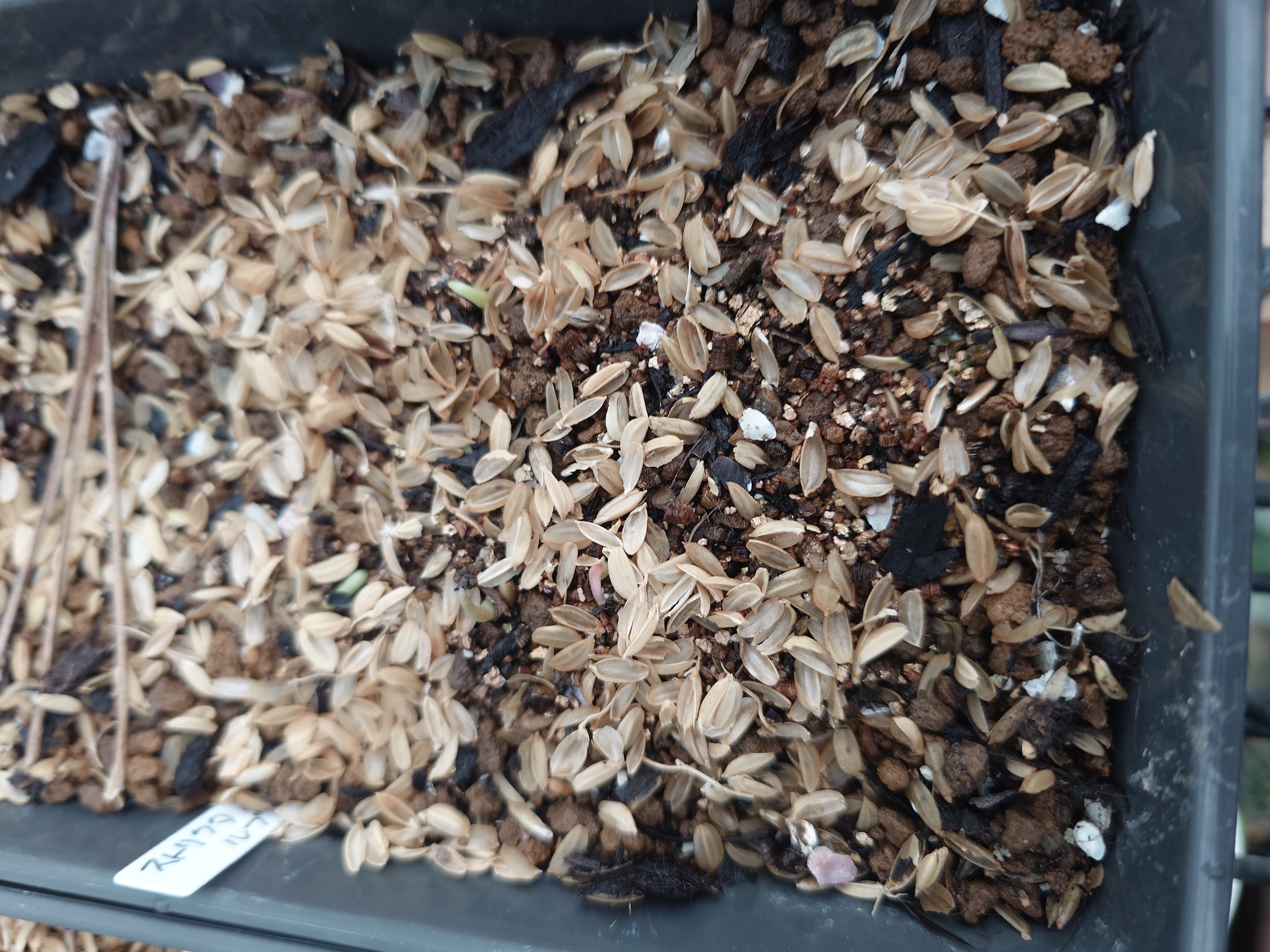 ・播種した種は、 バーミキュライトで薄く覆土し、籾殻を軽く撒いたり撒かなかったり。