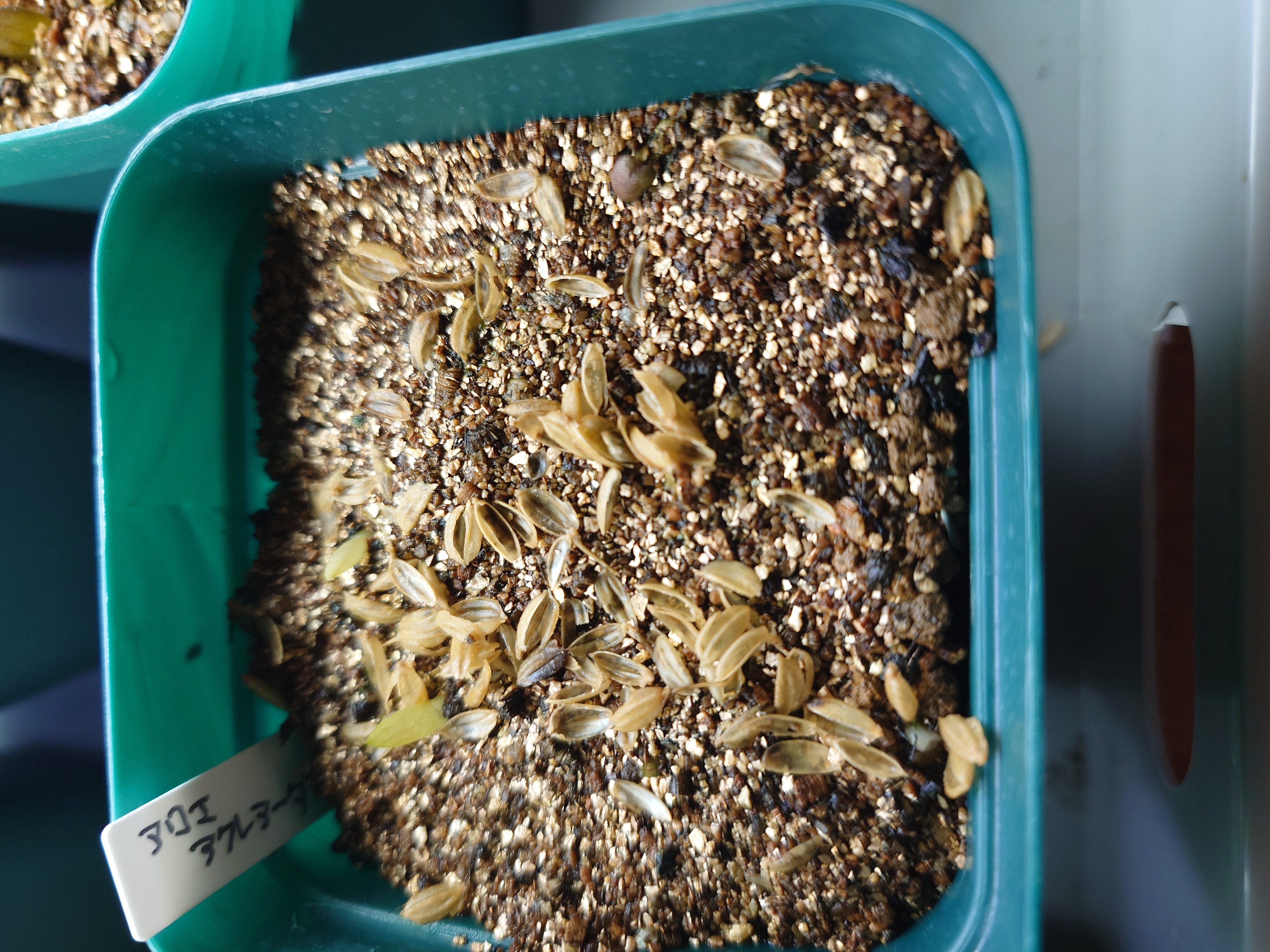 ・播種した種は、 バーミキュライトで薄く覆土し、籾殻を軽く撒いたり撒かなかったり。