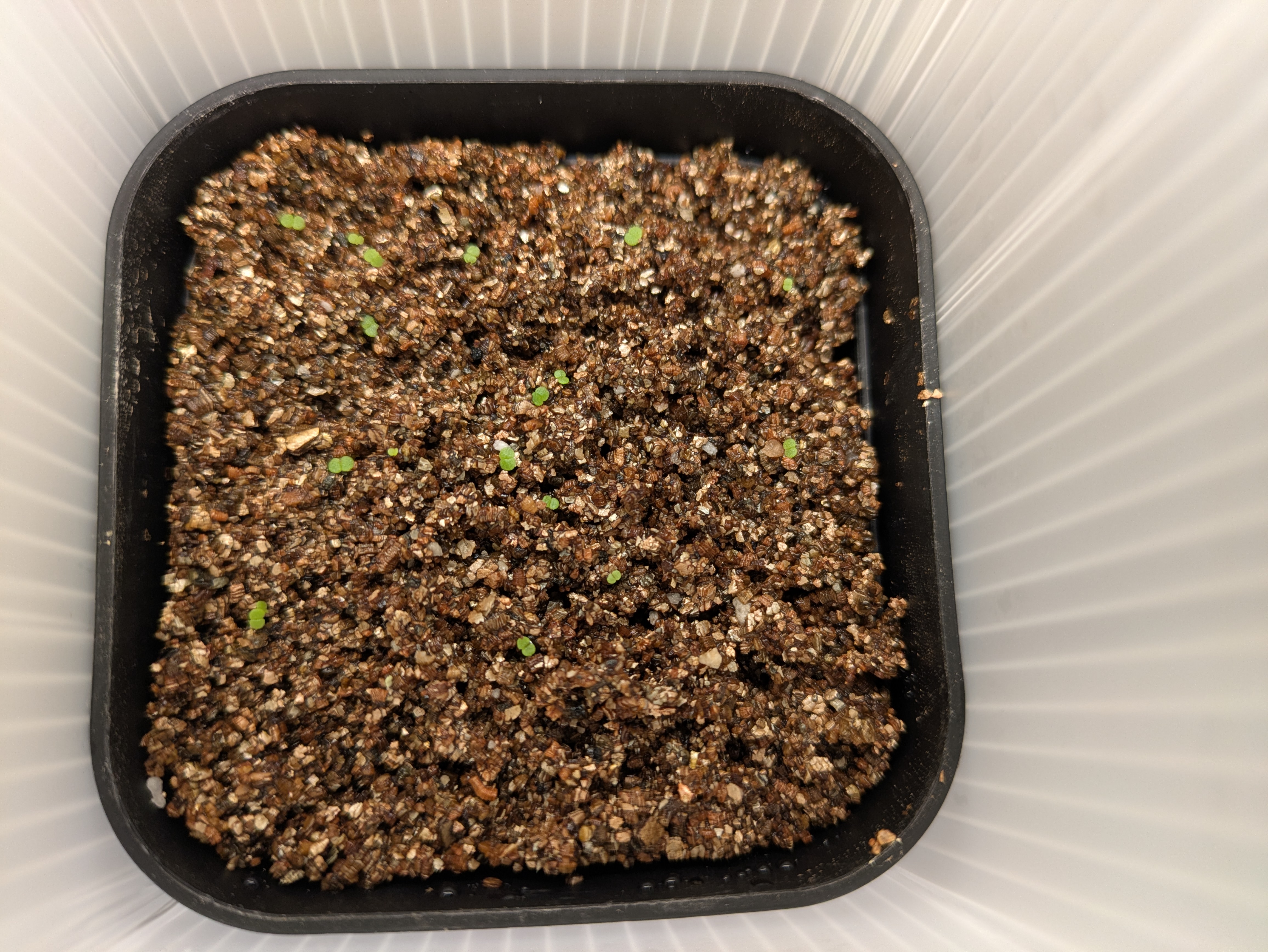 市販の多肉植物用土(無肥料)にバーミキュライトを敷き播種。播種前に用土は熱湯で消毒。