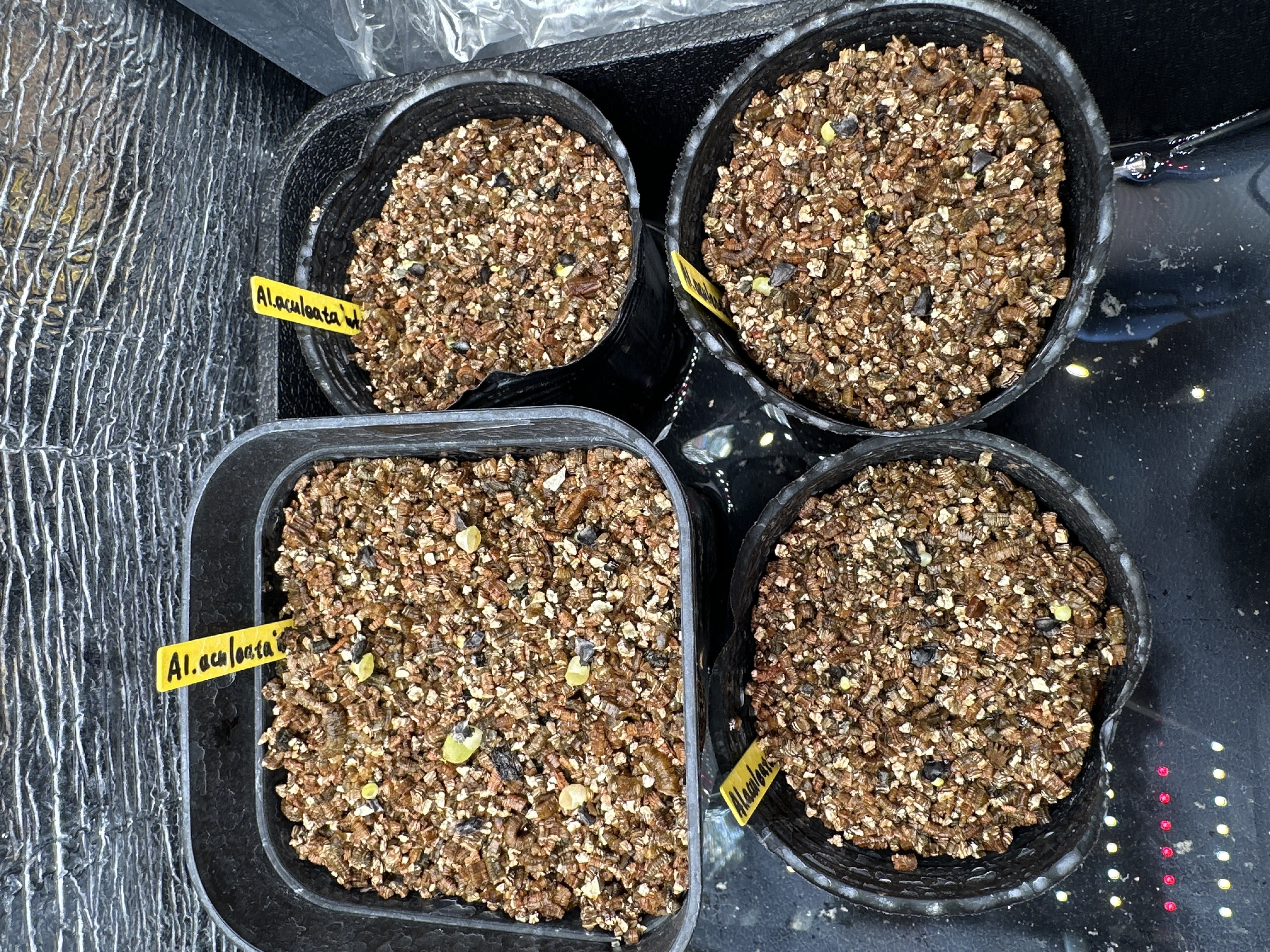 約25℃加温の物と約15℃室温の2通りに分け、加温管理のの方が先に発芽したため室温管理の物も加温に移行し、そちらも遅れて発芽。