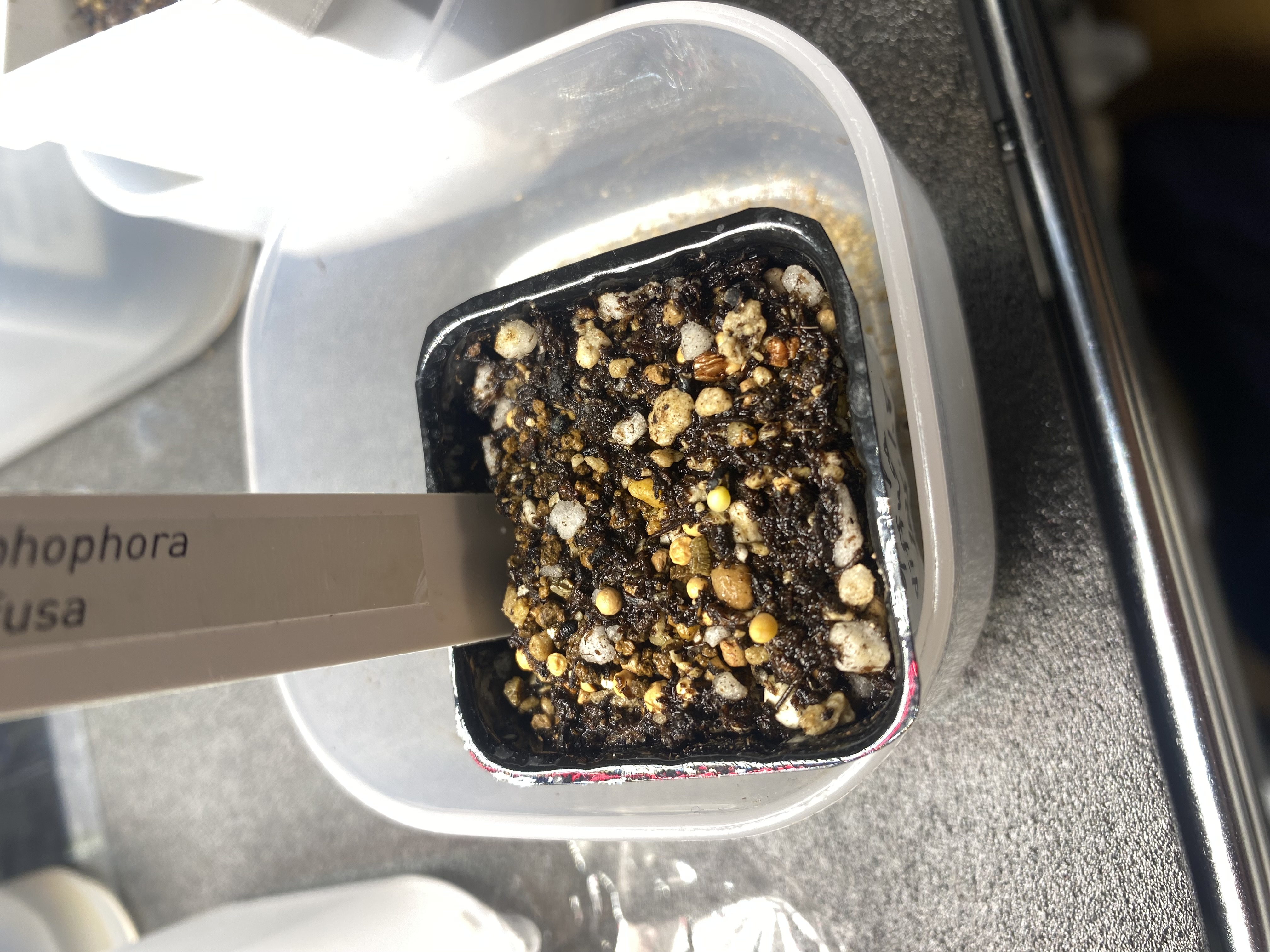 播種前にメネデール溶液に1日程度浸漬盆栽土とサボテンの土(dcm)の用土にさし芽種まきの土を覆土した上に播種
