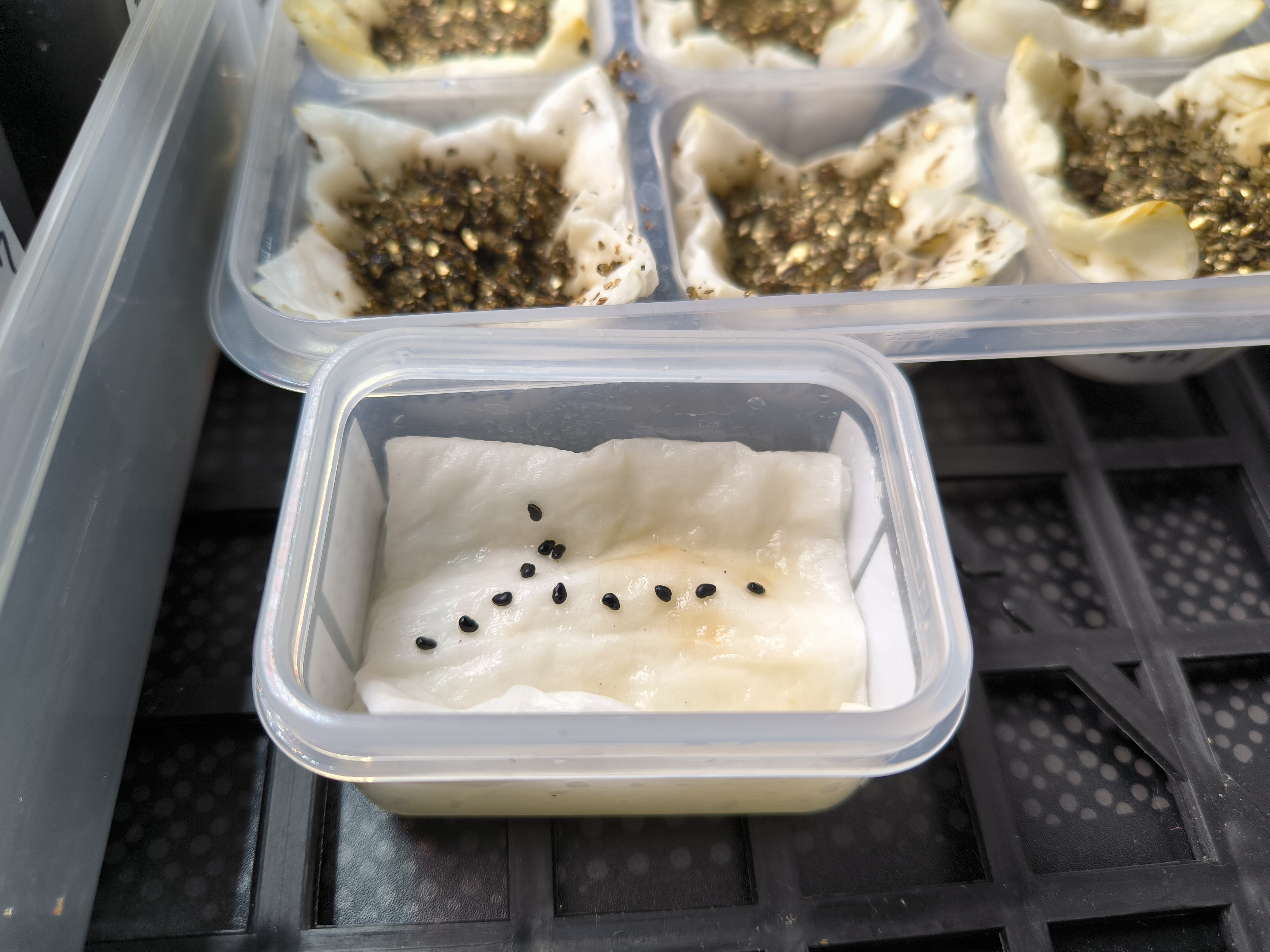 濡らしたキッチンペーパーの上に播種し、さらに種の上に保湿用の濡らしたキッチンペーパーを1枚被せた。