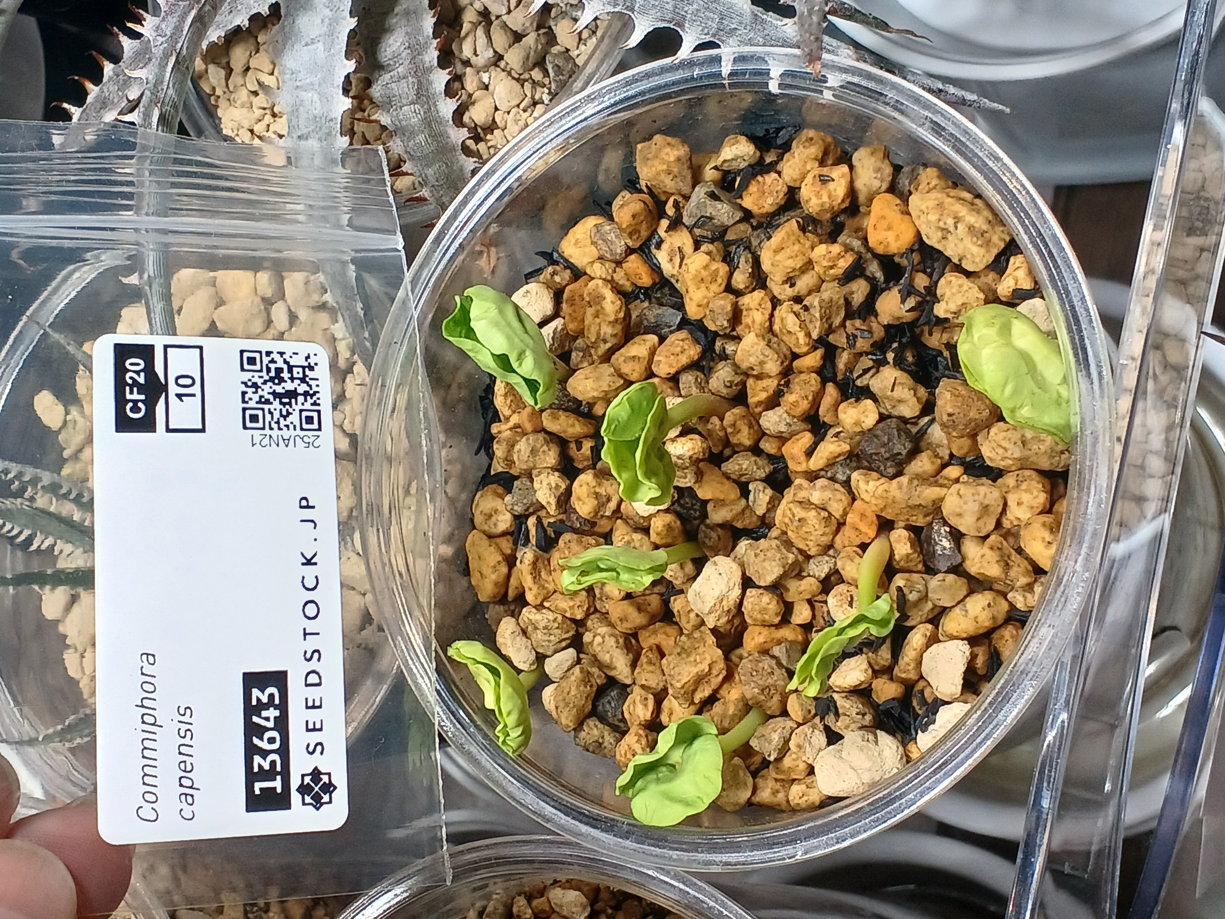細目のボラ土にもみ殻くん炭を少しまぜ、種子を置き隠れる程度にもみ殻くん炭をかけ、1cm程度ボラ土で埋めて播種、25度程度、LED、腰水管理で発芽。腰水はメネデール希釈水で、播種時にカビ防止のため市販のスプレー薬を散布。発芽が揃ったあとは腰水を止める予定です。思っていた以上に発芽してくれました。